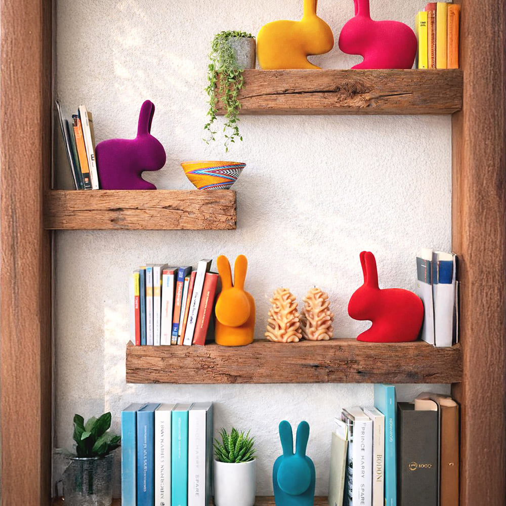 愛と豊穣を象徴するウサギのフォルムに、やわらかなベルベットタッチのフロック仕上げを施したブックエンドです。