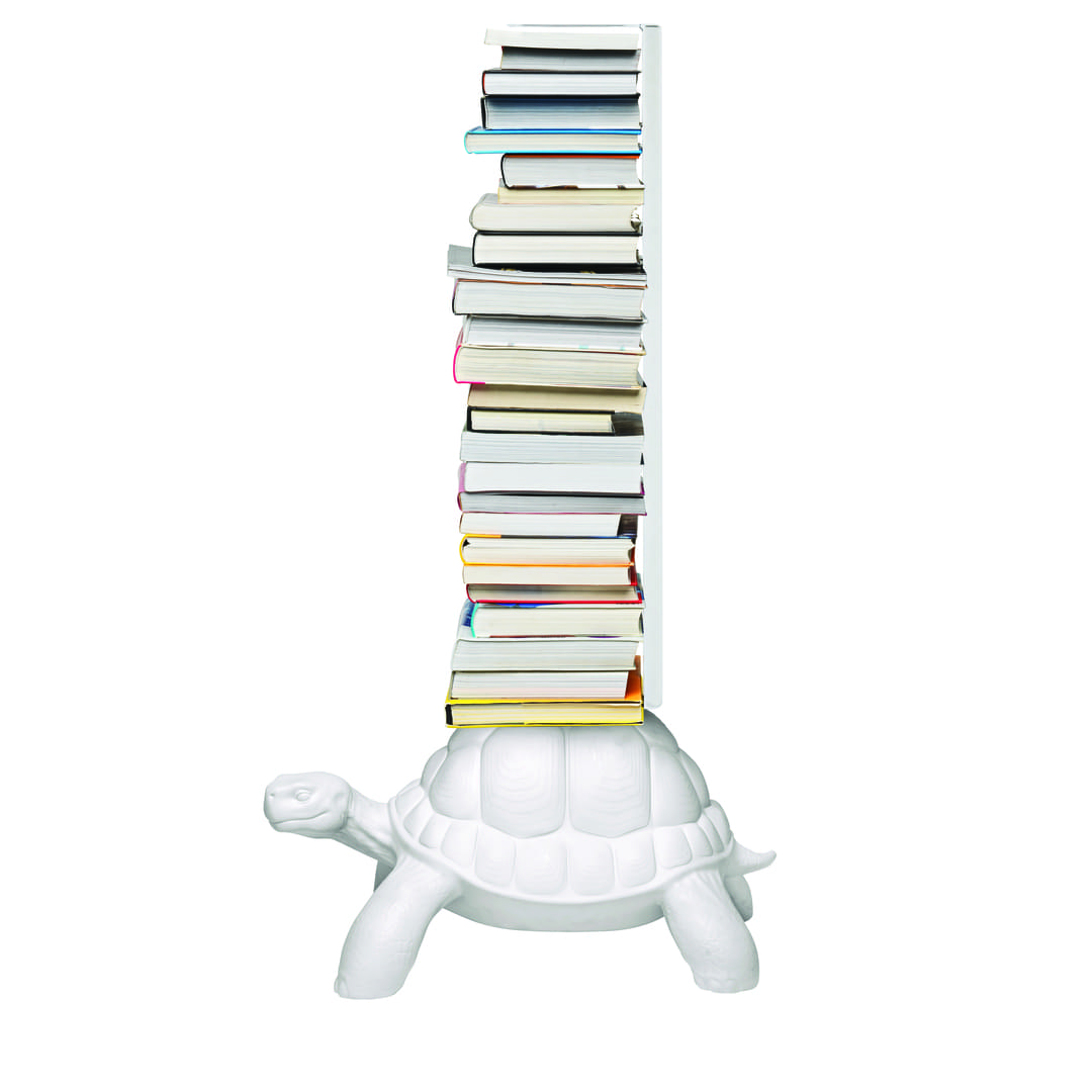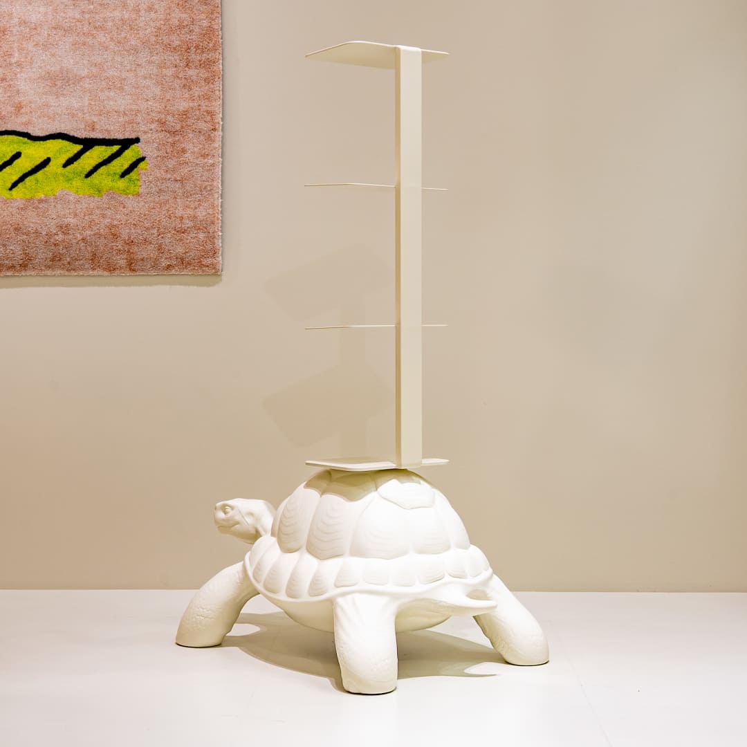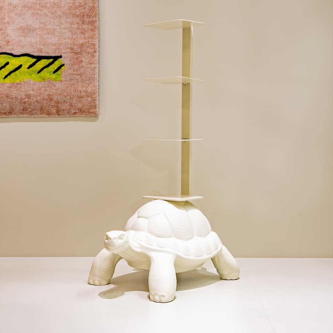 甲羅から3段のスチール製棚フレームが立ち上がります。本や小物を収納でき、スタンドアロンの彫刻としても成立します。サイズは幅40 × 奥行58 × 高さ93cm、重量約1.3kg。屋内乾燥環境での使用を推奨。カラーはホワイト、ダブグレーほか展開。