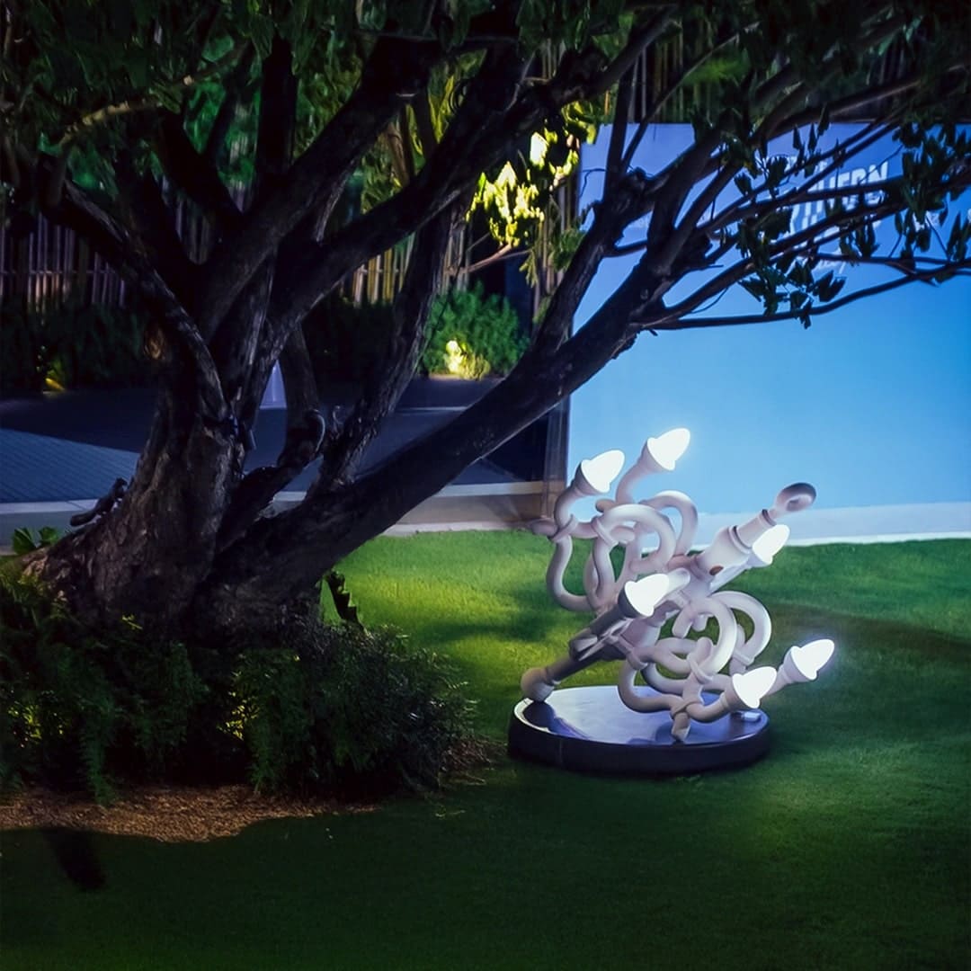 シャンデリアが床に落ちた造形は、エレガンスの象徴にほんの少しの皮肉を添え、空間に静かなユーモアを漂わせます。