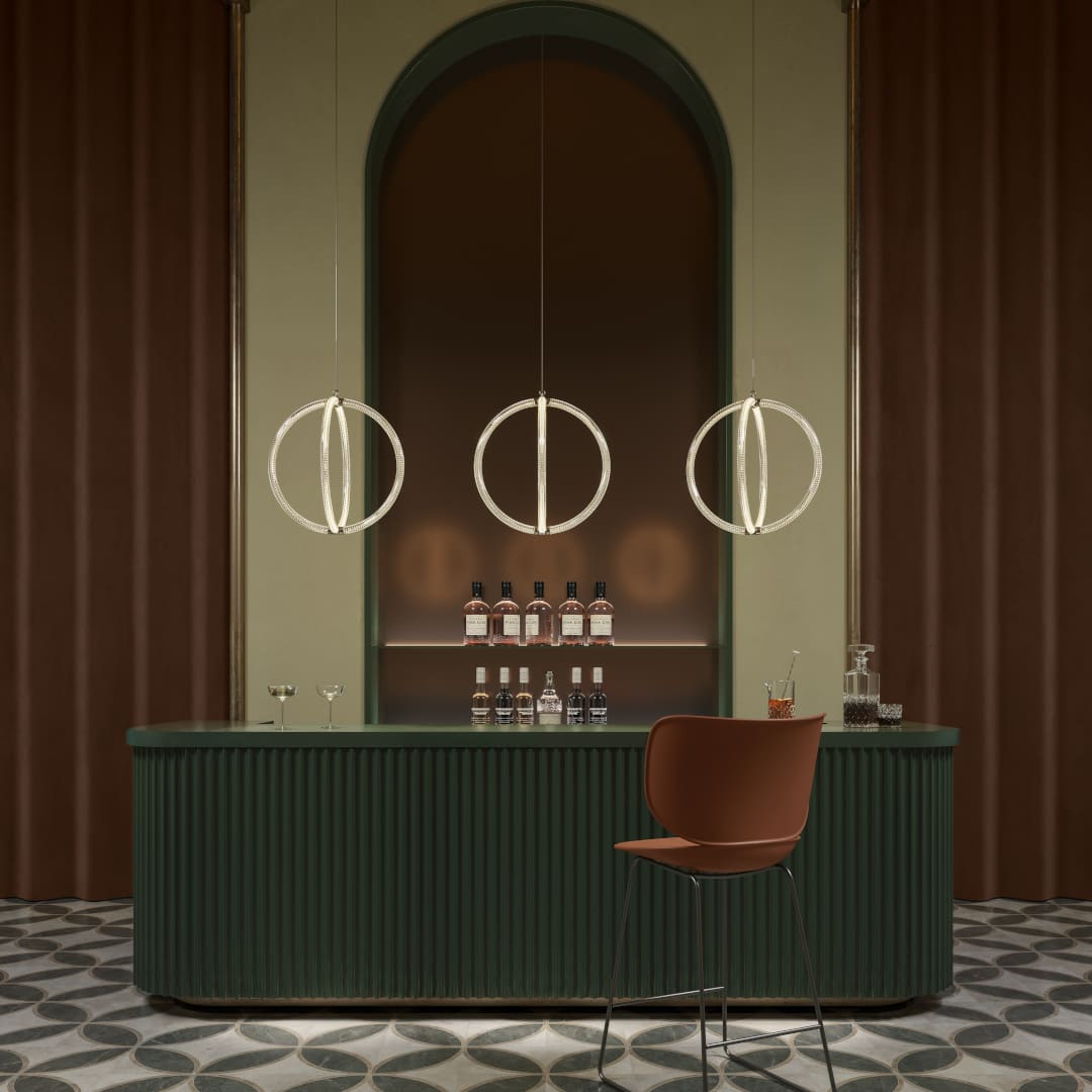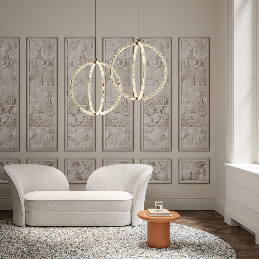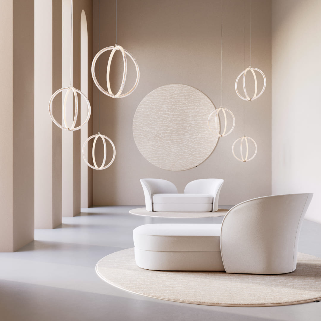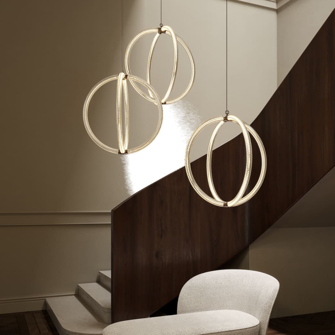 ムラーノガラスのシャンデリアの壮麗さと、ルカ・パチョーリの『神聖比例論』に着想を得た普遍的な美が完璧なバランスで融合した「ルミノーラライト|Luminora Light」。