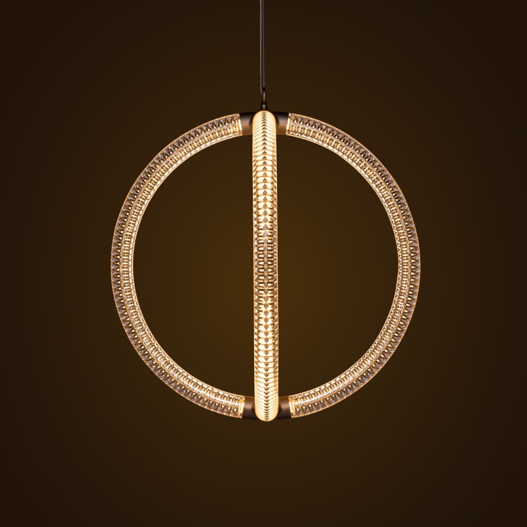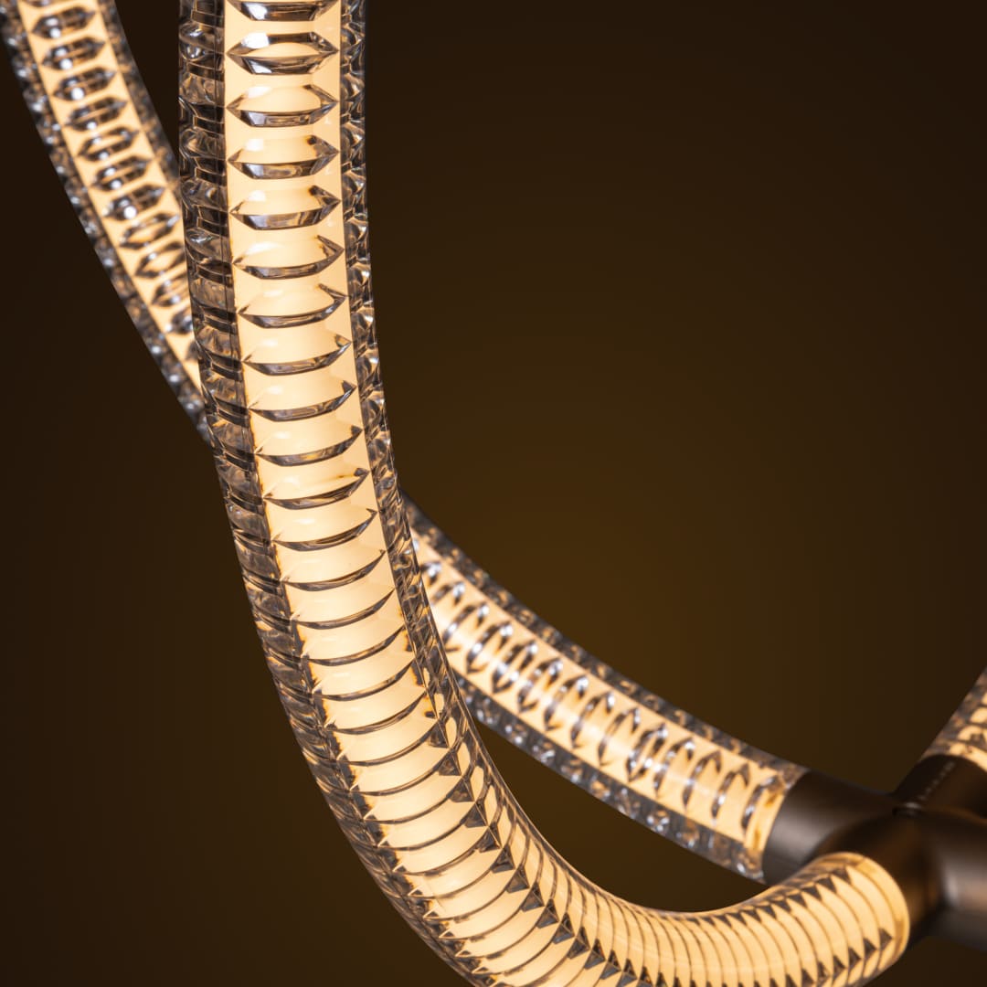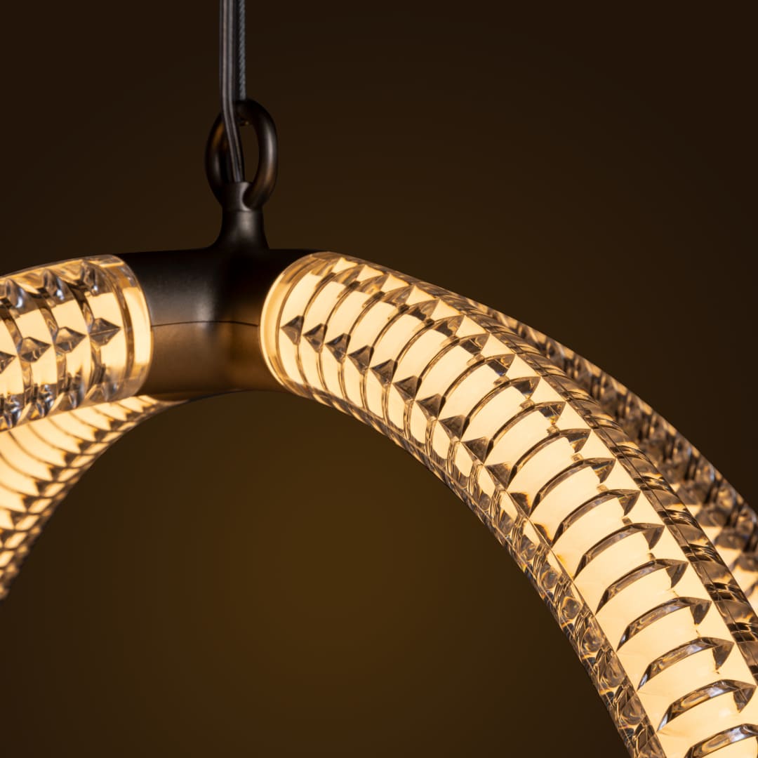 バロック装飾の華やかさを想起させるV字型カットのダイヤモンド光学パターンと、透明なチューブに封じ込めた光が織りなすきらめきはガラス工芸品を思わせます。