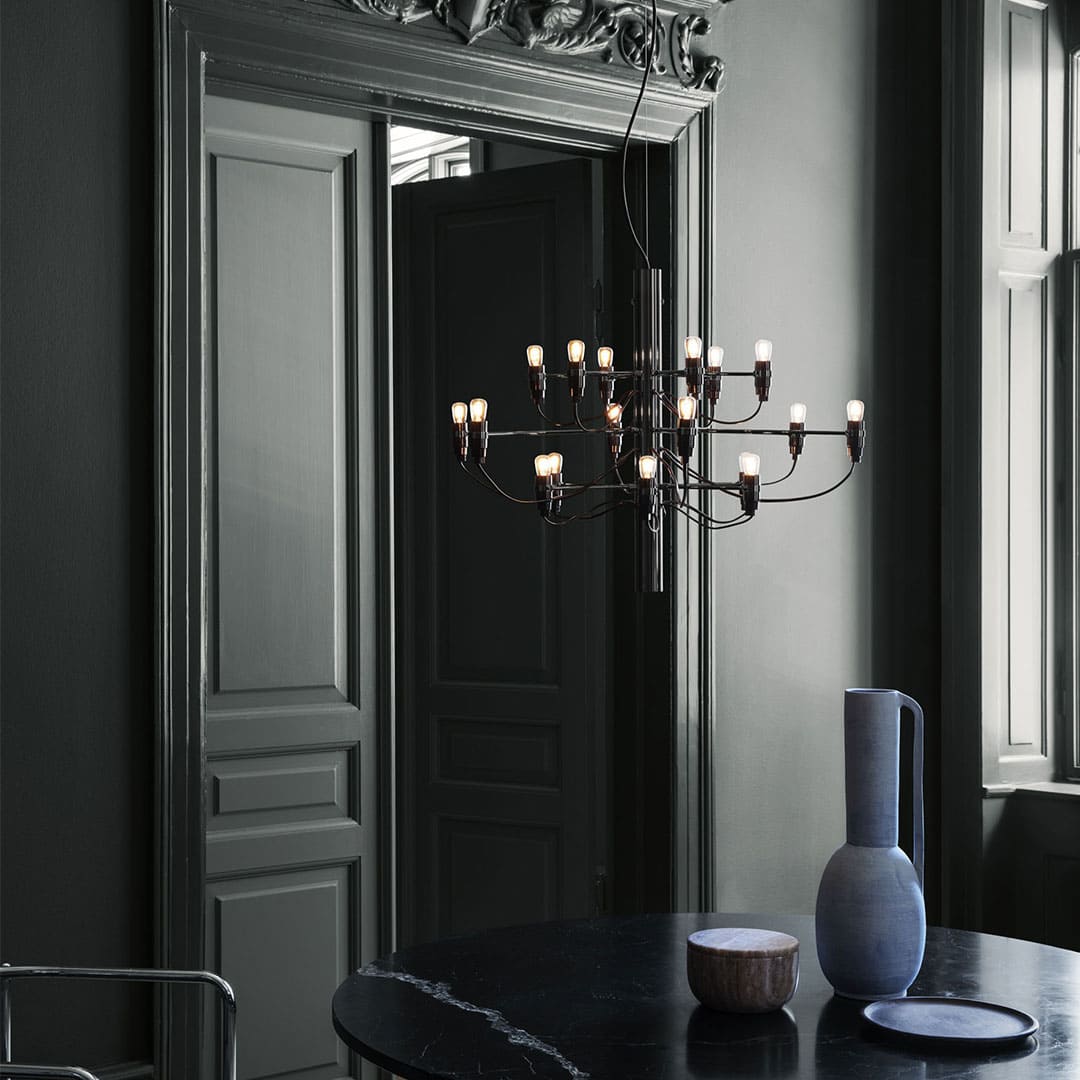 ヨーロッパの伝統的なシャンデリアを再解釈し、ソケットやコードといった機能的要素をあえてデザインの一部として見せる革新性は、発表から65年以上を経た今も色褪せることなく、世界中の空間を照らし続けています。