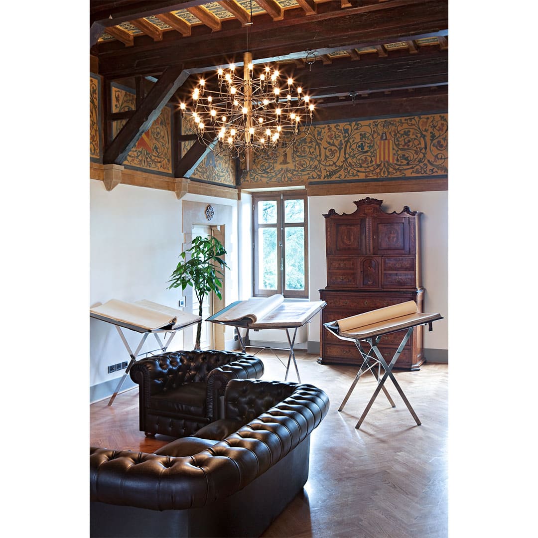 ヨーロッパの伝統的なシャンデリアを再解釈し、ソケットやコードといった機能的要素をあえてデザインの一部として見せる革新性は、発表から65年以上を経た今も色褪せることなく、世界中の空間を照らし続けています。