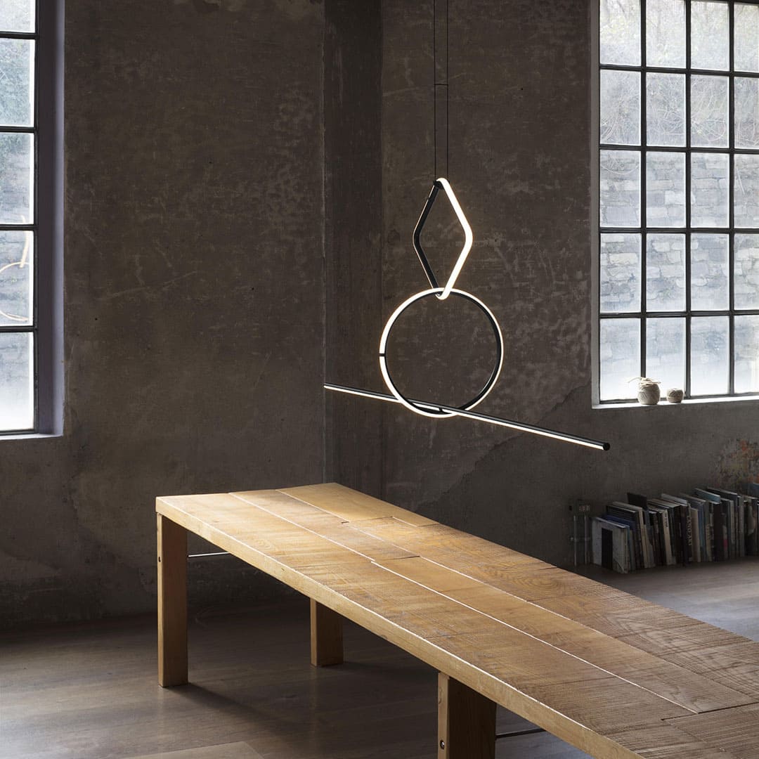 円、直線、ドロップなどの幾何学的エレメントを自由に組み合わせ、まるでジュエリーのように光を構成する革新的な照明です。