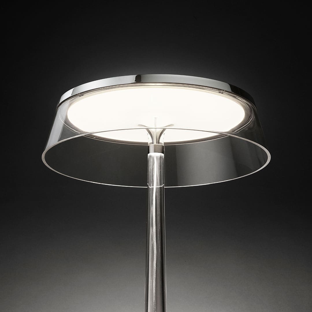 透明なポリカーボネートのシェードとアルミベースが軽やかな印象を与え、調光機能付きLEDが柔らかく上質な光を生み出します。