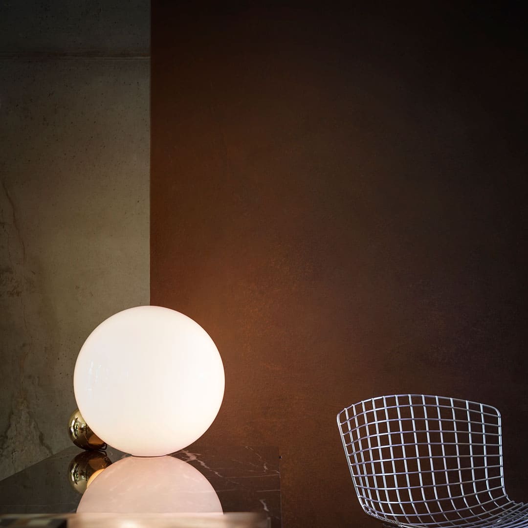 ガラスシェードから放たれる柔らかな光は、空間に静謐で上質な雰囲気をもたらし、ゴールド、クローム、ブラックなどの仕上げが選択可能。