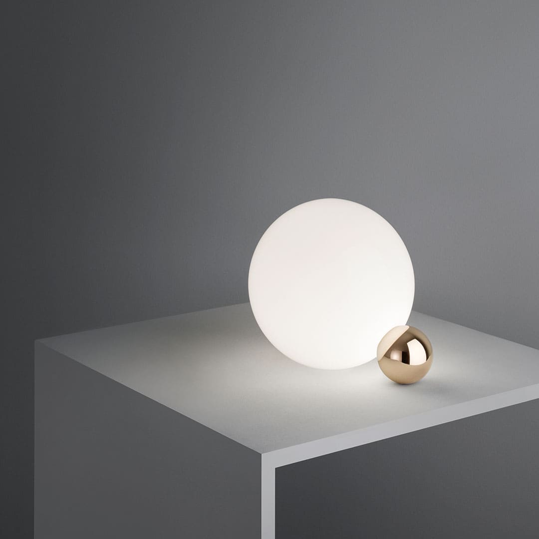 大小二つの球体が寄り添うように配置され、大きな乳白ガラスの球体を小さな金属球が支える構造は、まるで詩的な対話を交わすかのような佇まいを見せます。