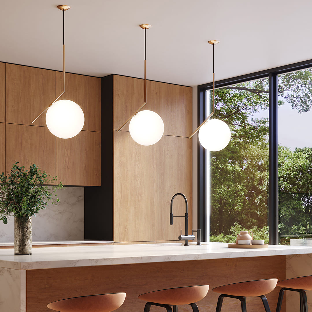 「このコレクションはバランスを探求しています。テーブルライト、ウォールライト、ペンダント、シーリングライトというシリーズがあり、すべて棒の端で完璧にバランスが取れた球体を基本形としています」とデザイナーは語ります。
