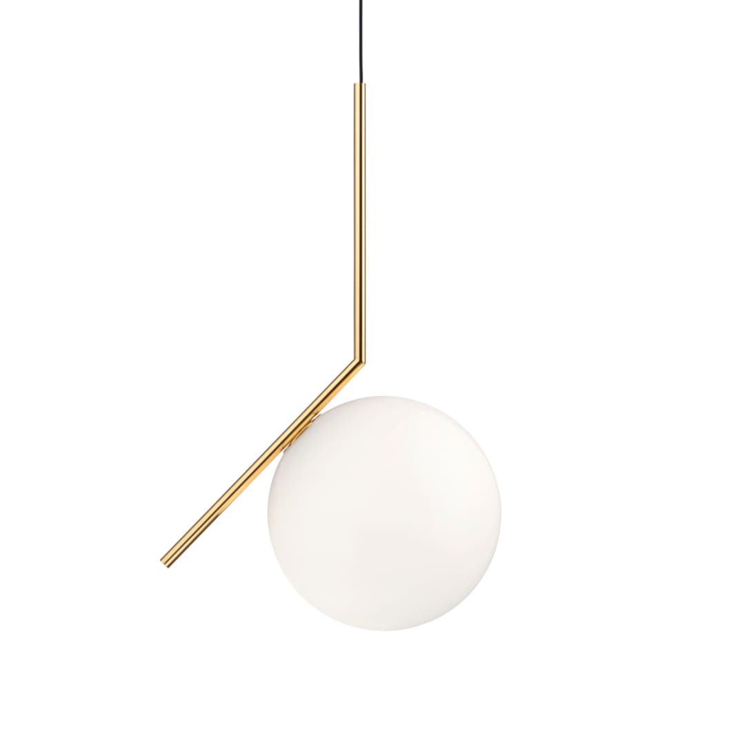 吹きガラス製の乳白色ディフューザーを通して拡散光を提供し、真鍮仕上げまたはクローム仕上げのスチールフレームで支えられています。