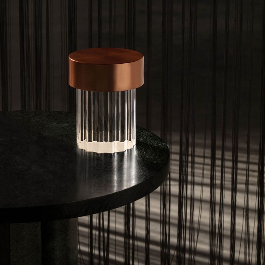 古代ギリシャの円柱を思わせる透明なガラスベースに光源を収め、上部のシェードから柔らかな光を放ちます。