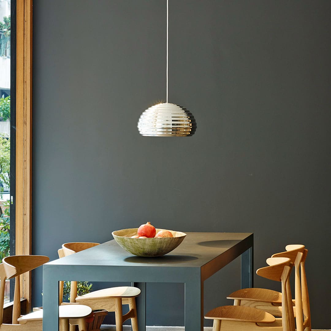 アルミニウムをスピン加工したシェードには同心円状の溝が刻まれ、光を柔らかく拡散しながら独特の陰影を生み出します。