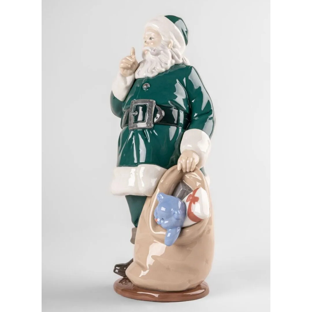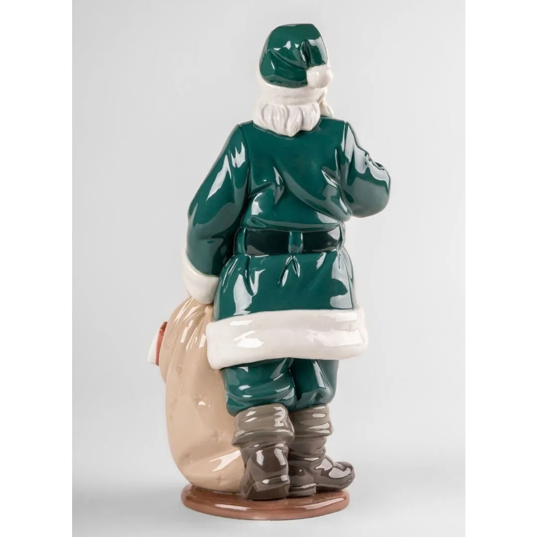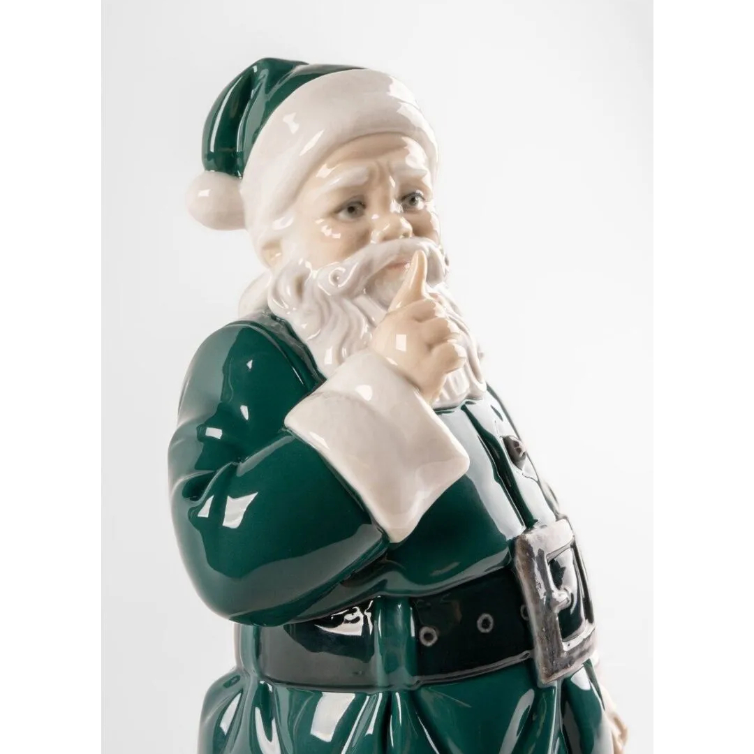 サンタの衣装は、ホリデーシーズンの人気カラー、深いグリーンで彩られています。