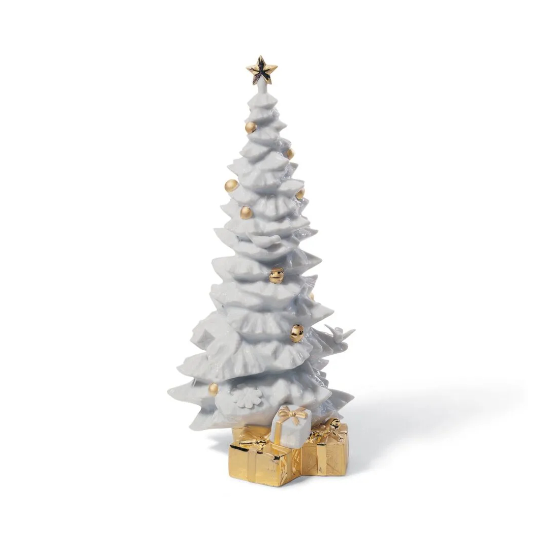 リヤドロの人気のクリスマスツリー「クリスマスの贈りもの」を磁器本来の美しい白と華やかな金彩で飾りました。 磁器の白さが積もった雪を連想させます。