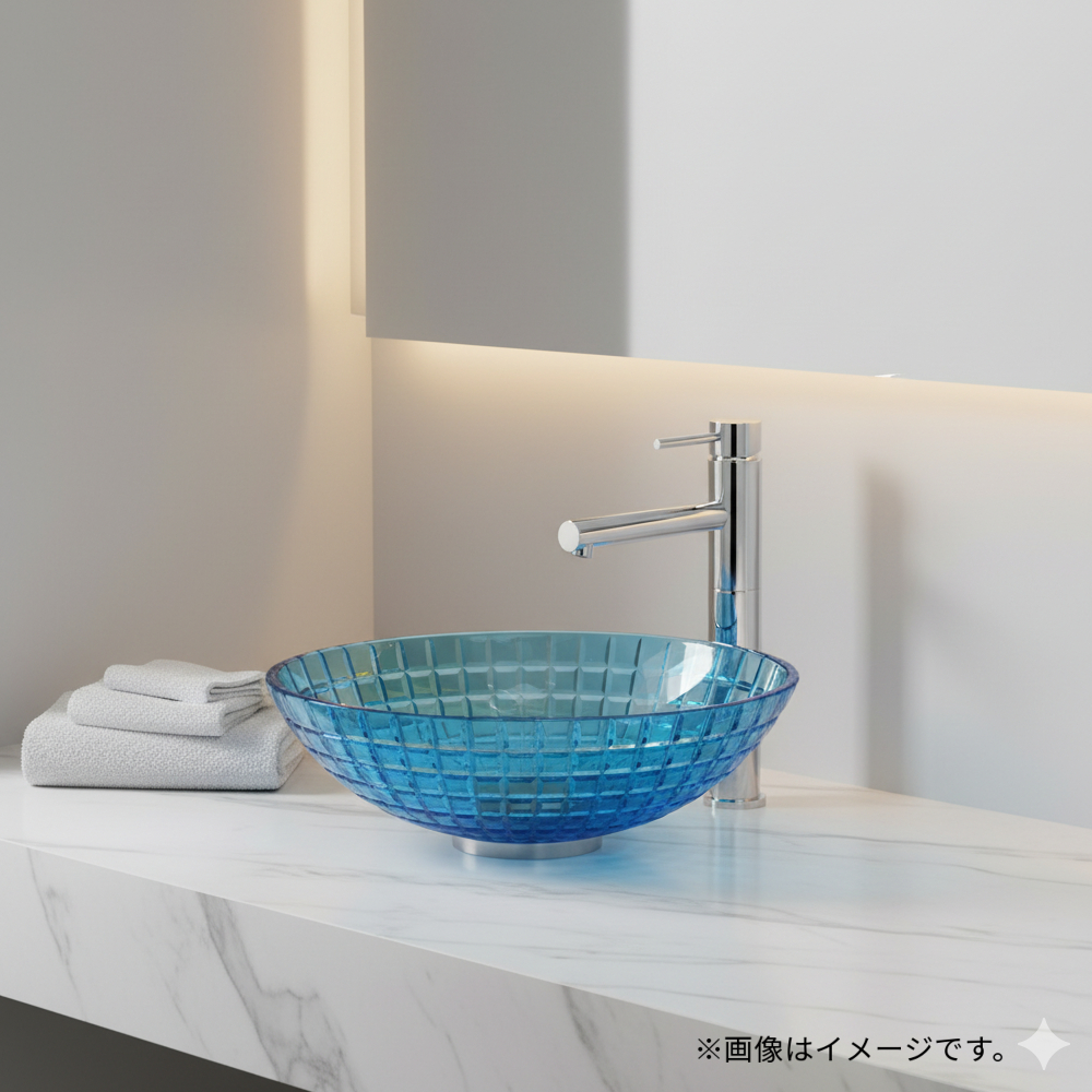 マリンブルー色のガラスが美しい洗面ボウルと水栓の期間限定セット品です。
