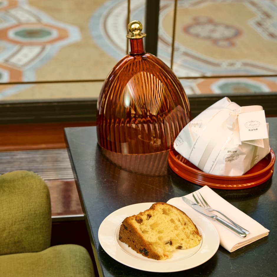 2025年クリスマス特別パネットーネは、KartellとMarchesi1824のロゴが両方入った特別なパッケージに包まれ、「ラクーポール」のセンターピースの中にセットされます。