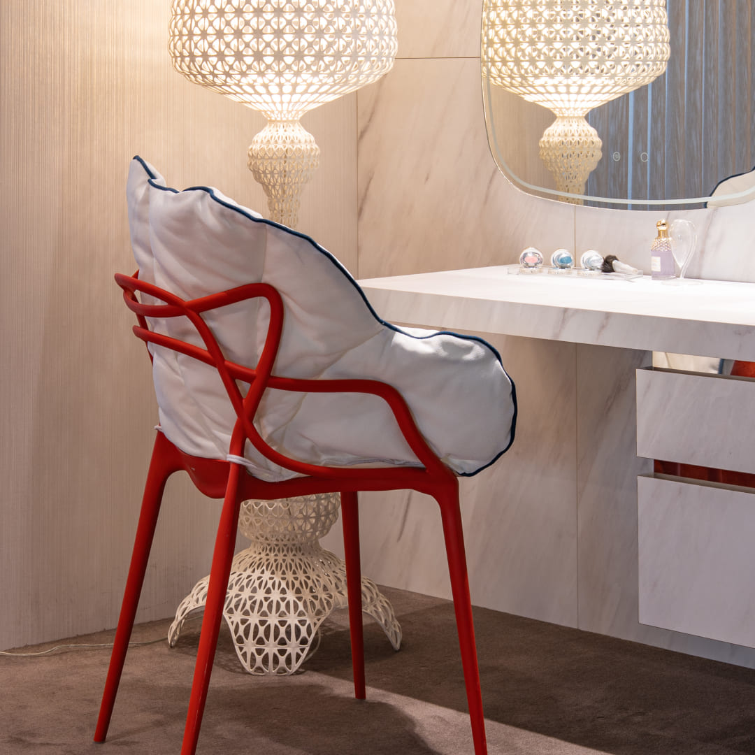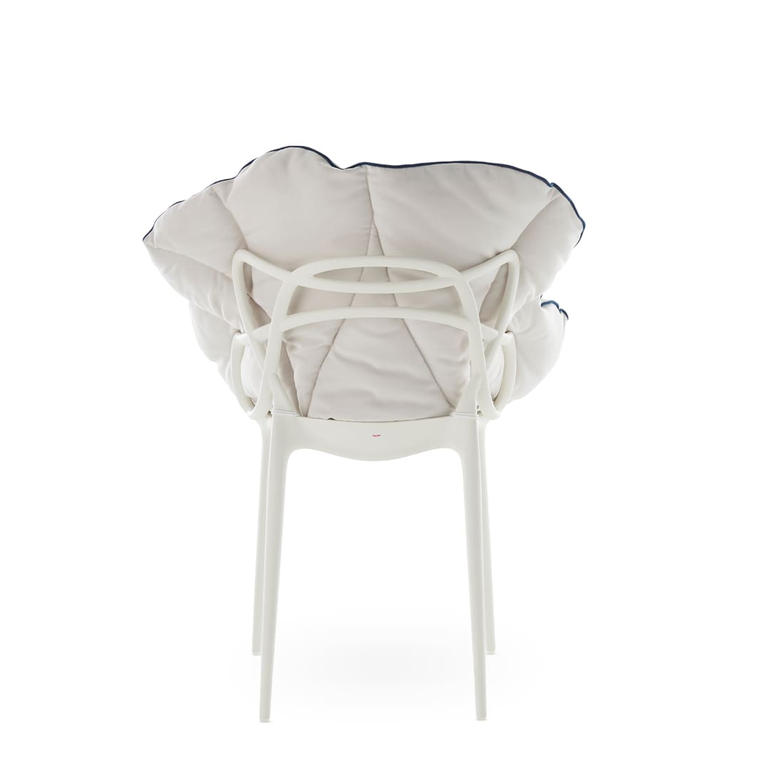 Kartellのアイコンであるポリカーボネート製チェアなどにこのクッションを合わせることで、ゆったりとくつろげるソフトなアームチェアのような使い心地にアップデートできます。