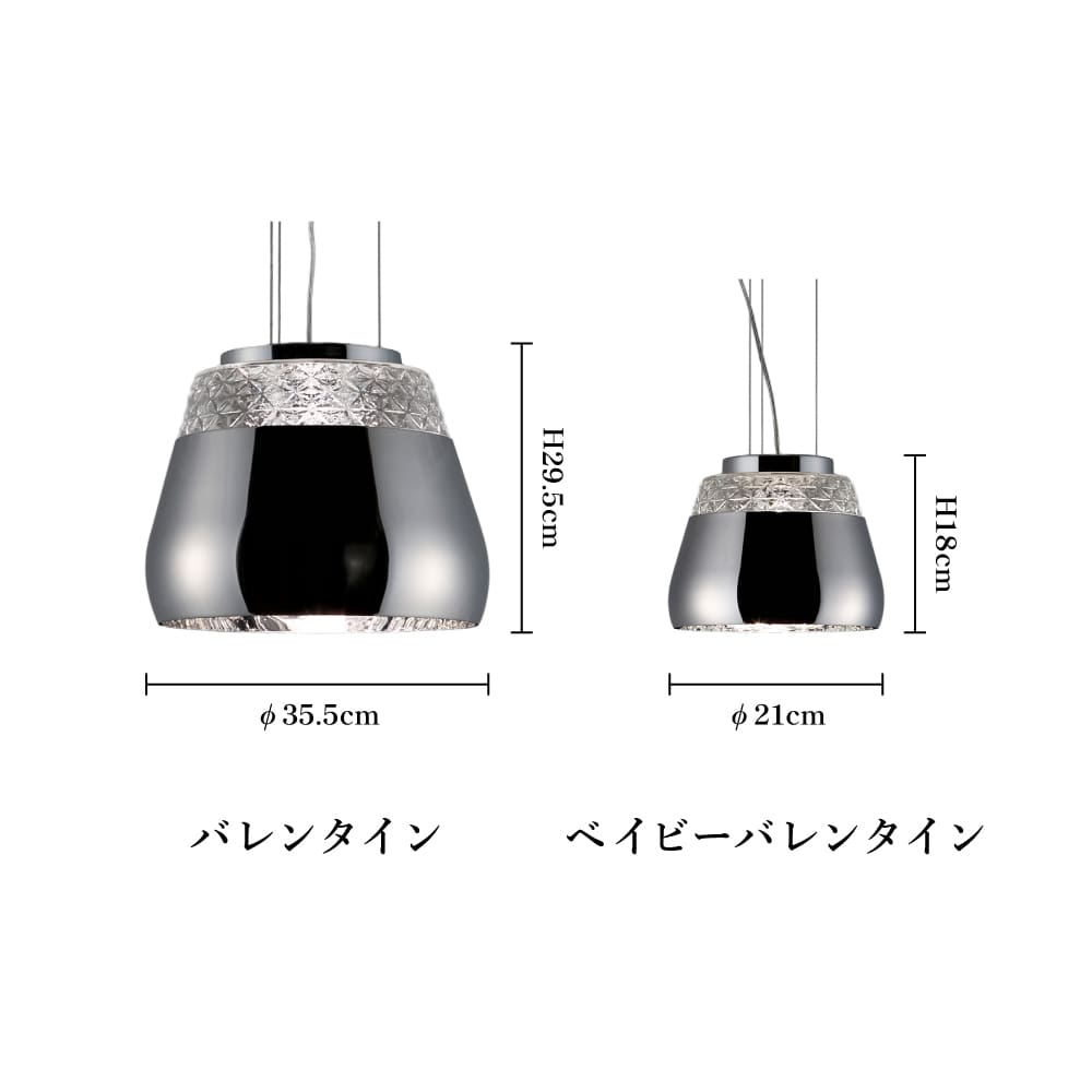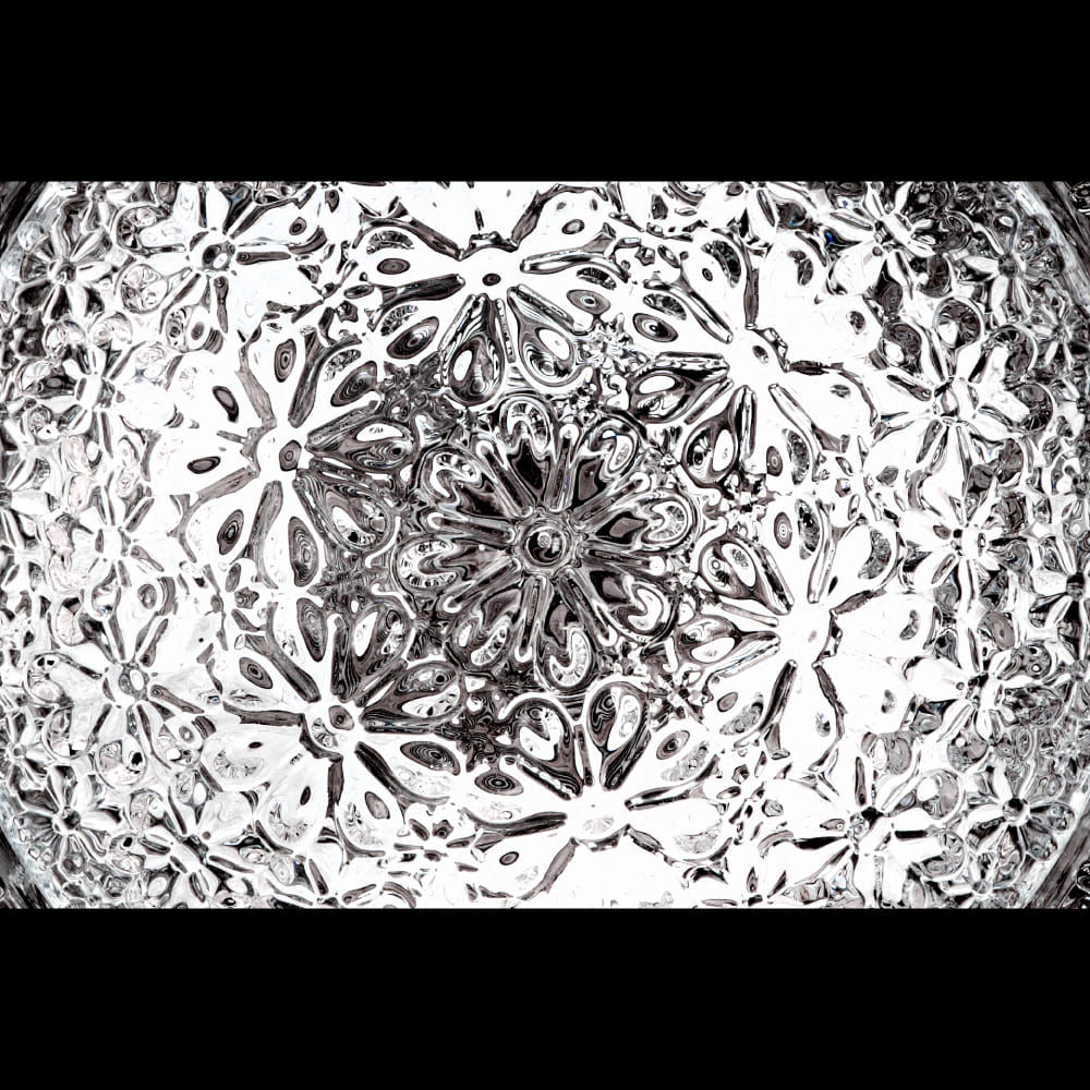 ペンダント照明「Valentine(バレンタイン)」のシェードは、クリスタルガラスと金属の異素材を組み合わせて構成されています。シェード外部に用いられたクリスタルガラスからは、点灯時に優しい光を放ちます。シェード内部のクリスタルに施された無数の花のパターンが、ベースのミラーに映り込むことで、より立体的に浮かび上がり、不思議な世界観が広がります。