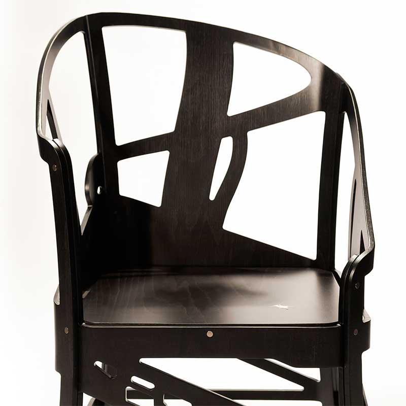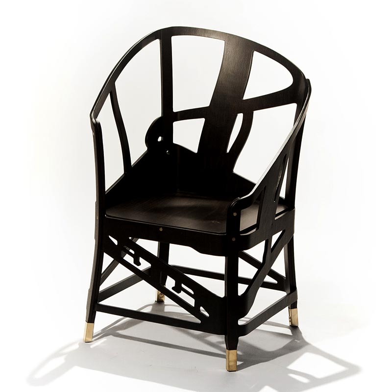 建築家のオットー・ワグナーの作品からインスピレーションを受けた、不思議なフォルムの椅子。実は一点の位置から見ると、目の錯覚により見慣れた家具のフォルムになるトリックアートな椅子です。