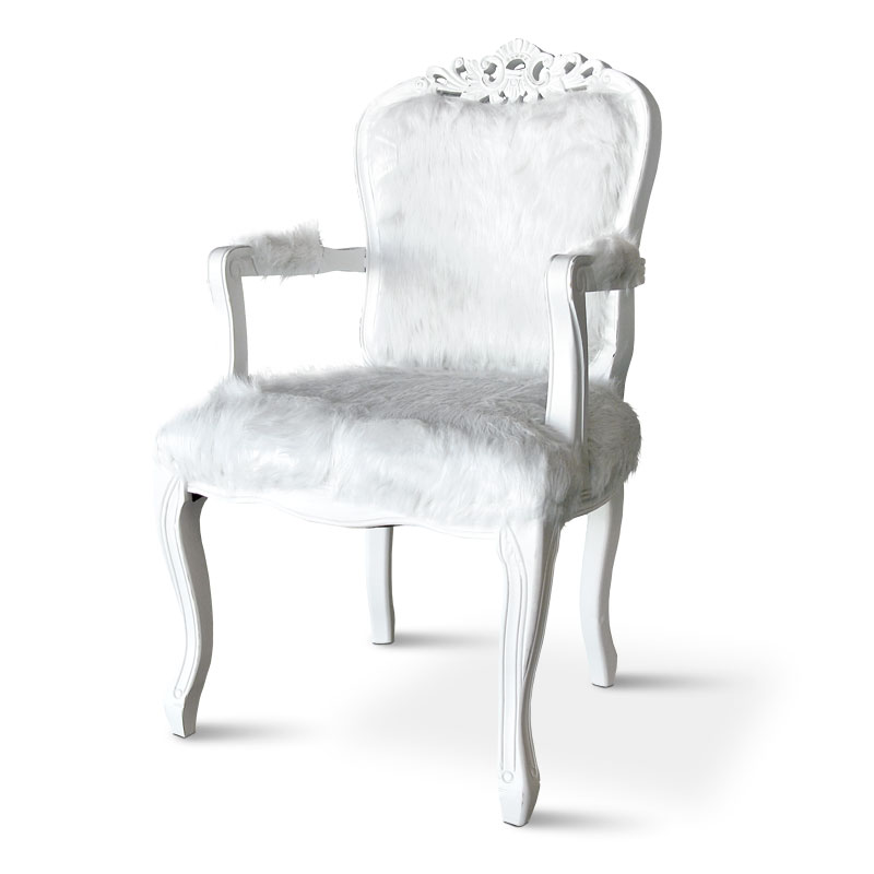 バロックスタイルの椅子に、毛足の長いファーをふんだんに使いました。クラシックなフォルムでありながらも、現代のインテリアのテイストを取り入れたデザイン。