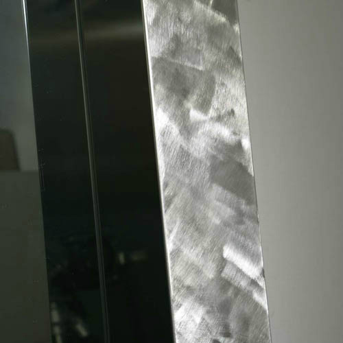 重厚感の中に、どこか気高い存在感を漂わせる「ARIA staineless」。フレームに刻まれた模様が存在感を際立たせ、鏡枠内部の奥行き(130mm)の深さが、そこに映り込む姿をいっそう立体的にさせる。