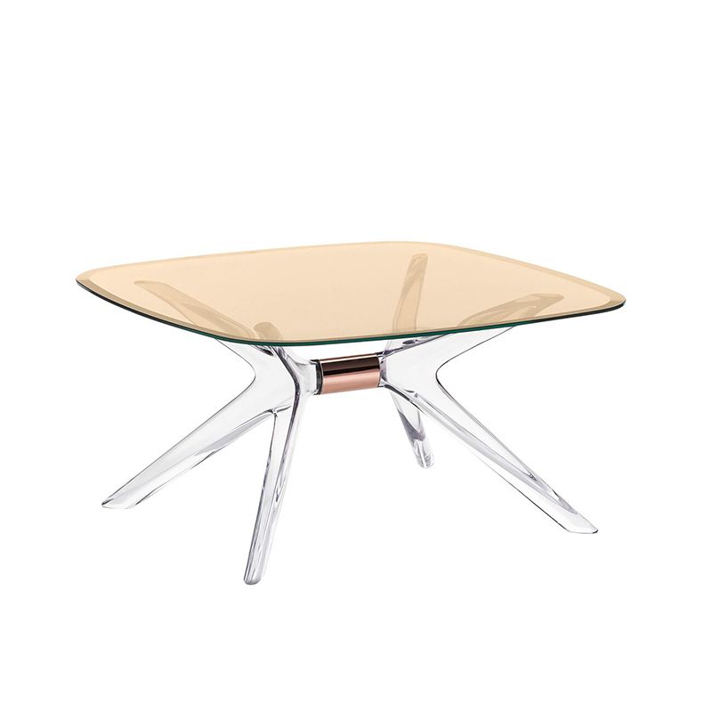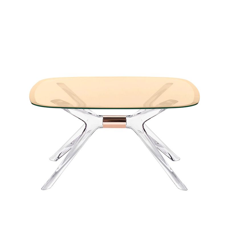 透明なガラストップとポリカーボネートの脚が組み合せらせたローテーブル。トップにはカラーバリエーションがあり、美しい透明なカラーレイヤーを楽しむこともできます。