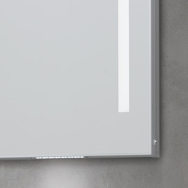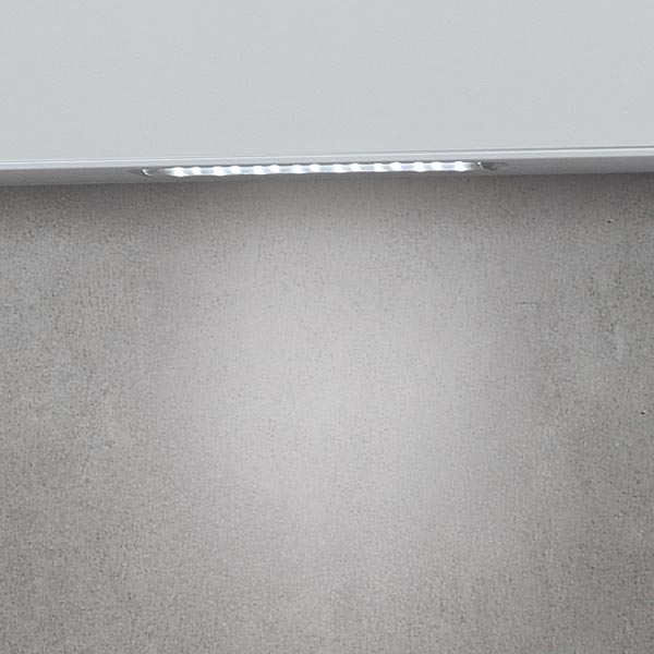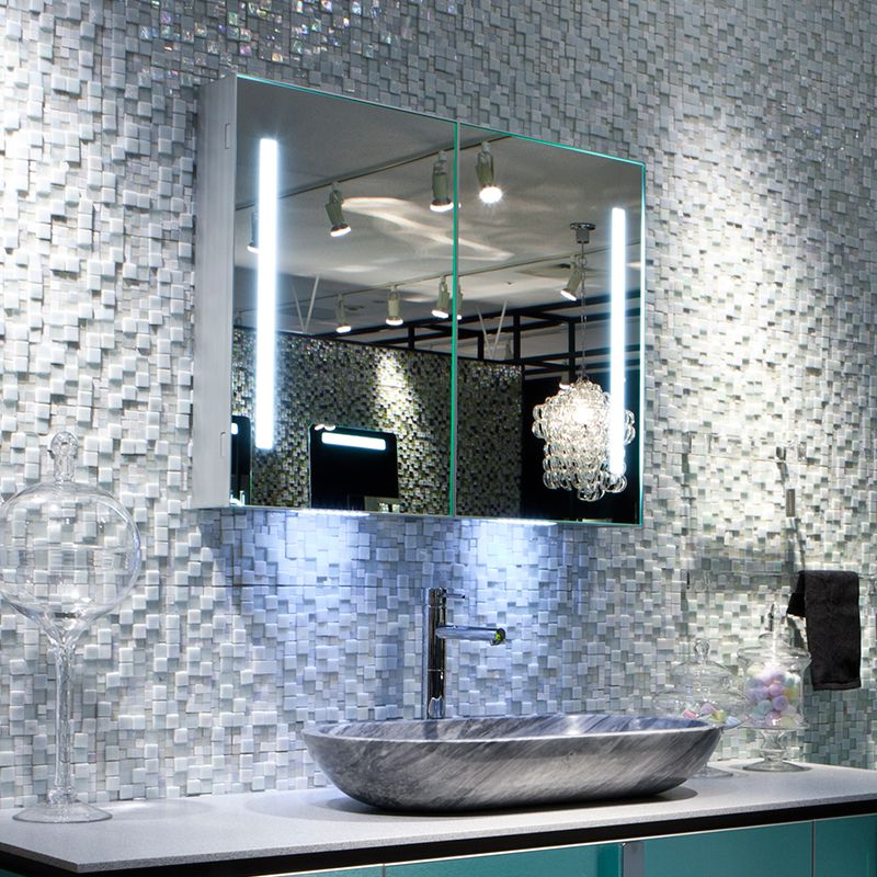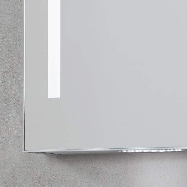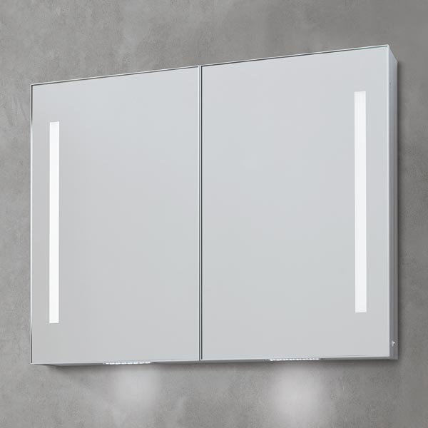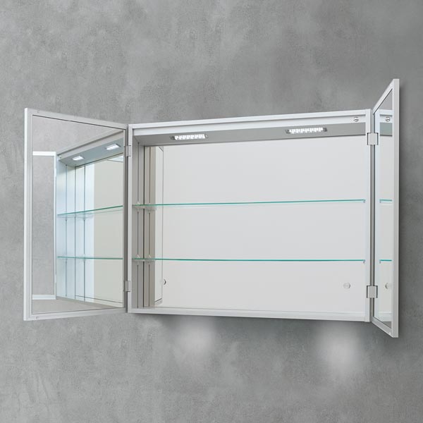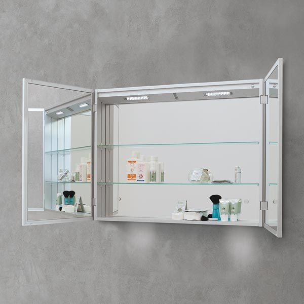 扉を開けば三面鏡にもなるミラー。キャビネットには棚がついているので、洗面周りのちょっとしたものを収納できます。