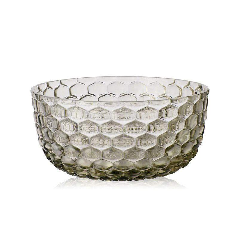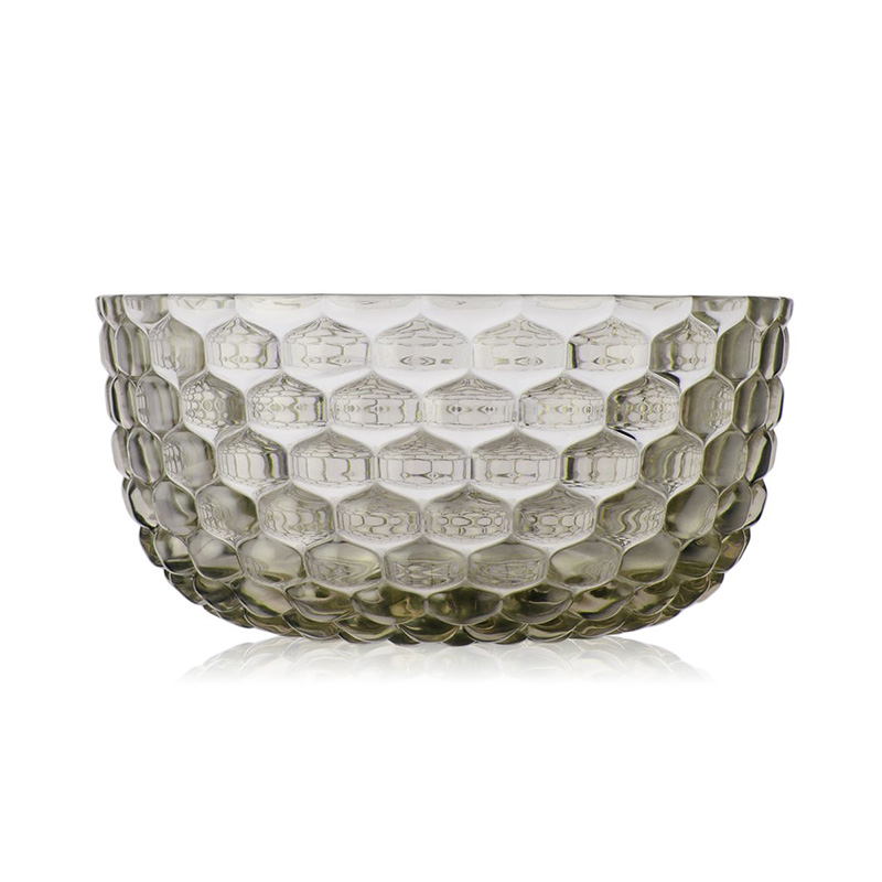 クリスタルガラスやダイヤモンドは、カッティングによって輝きや印象が変わります。このジェリーズも、表面のテクスチャ―デザインへのあくなき研究によって、今までのプラスチック製の食器では考えられなかった、驚きの美しさを実現させました。