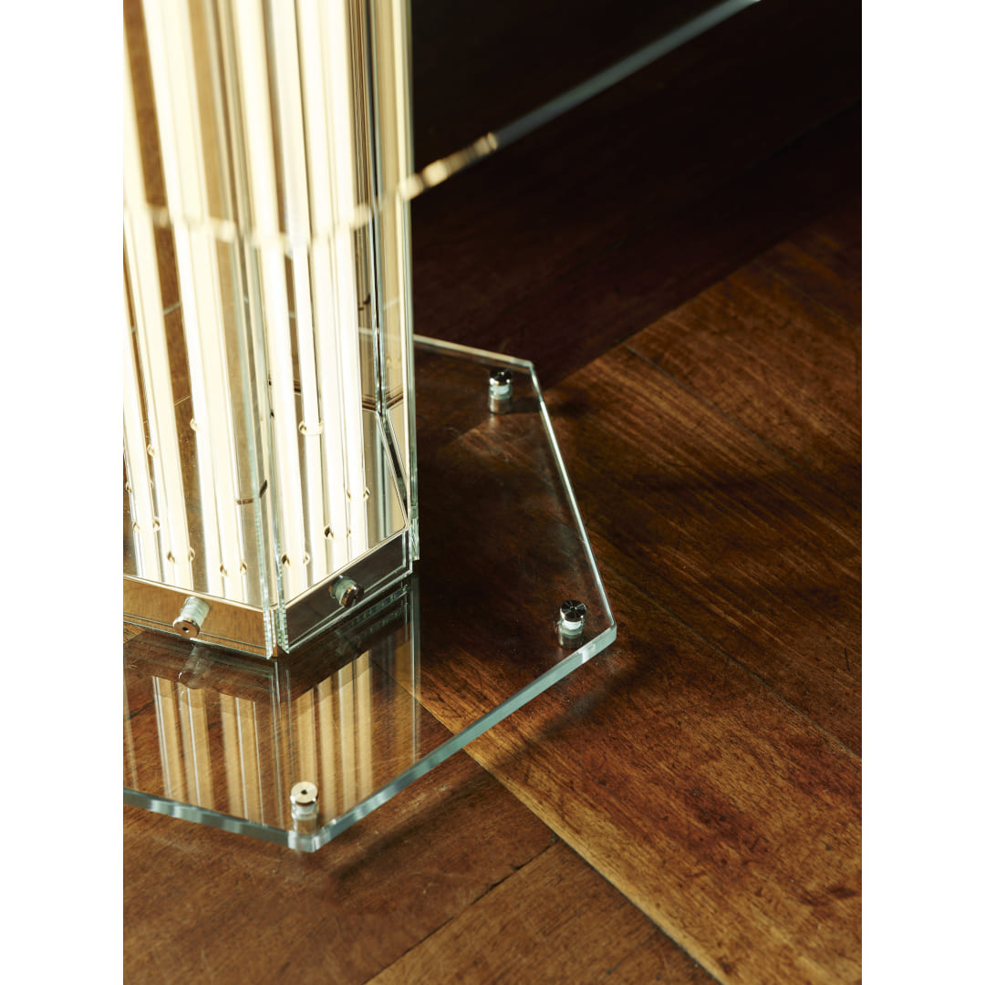 12本のストリップがそれぞれ、太さがスパゲッティほどのガラス製の細管に収められ、六角形のガラスモジュールの内側に静かに並んでいます。