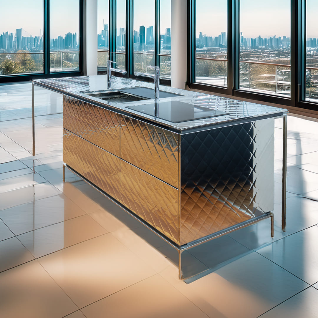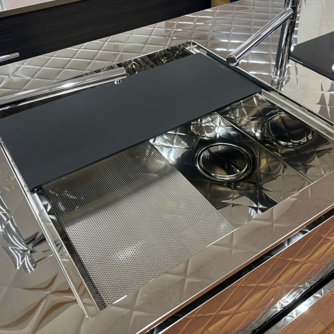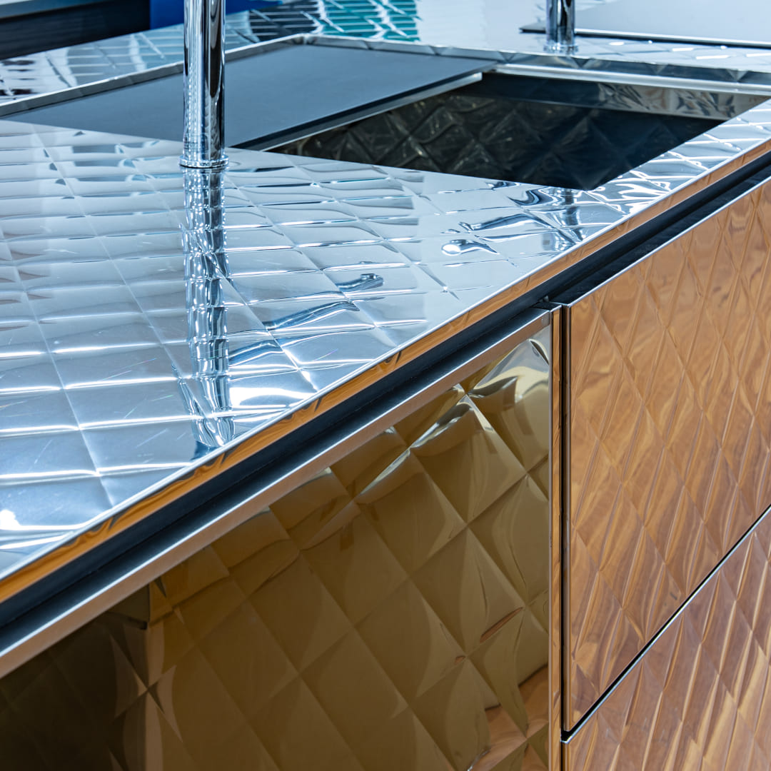 ステンレスにデザインを施した新感覚ワークトップ。美しいだけでなく、特殊なプレスパターンによって傷がつきにくく目立ちにくいため、永く美しく使い続けられます。