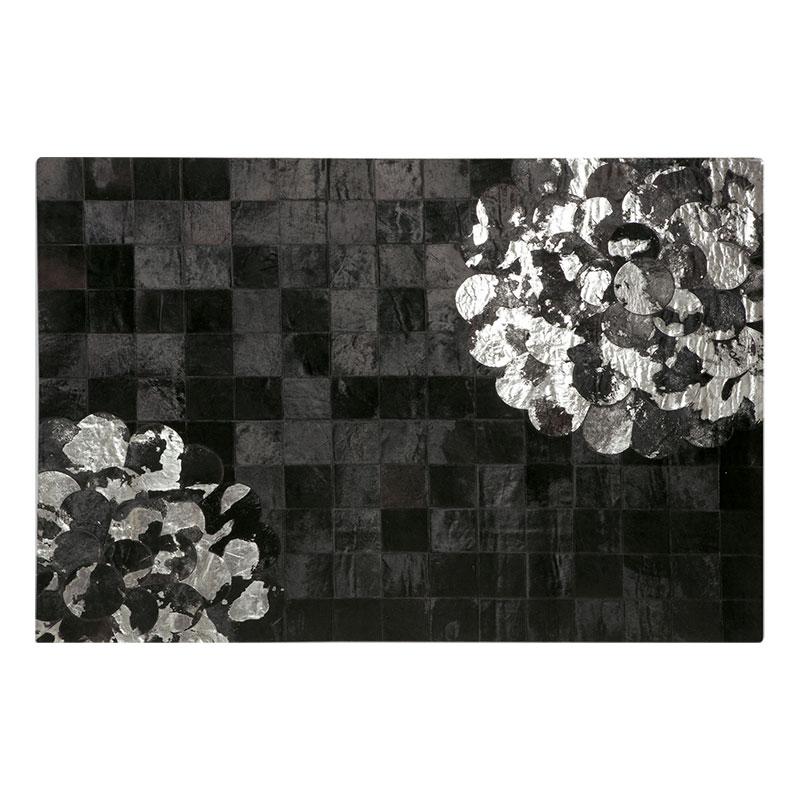 全体的にハラコ素材の切替でパターンや模様を表現したラグです。ゴールドやシルバーなどのカラーリングもウールなどでは出せないハラコならではの特徴です。