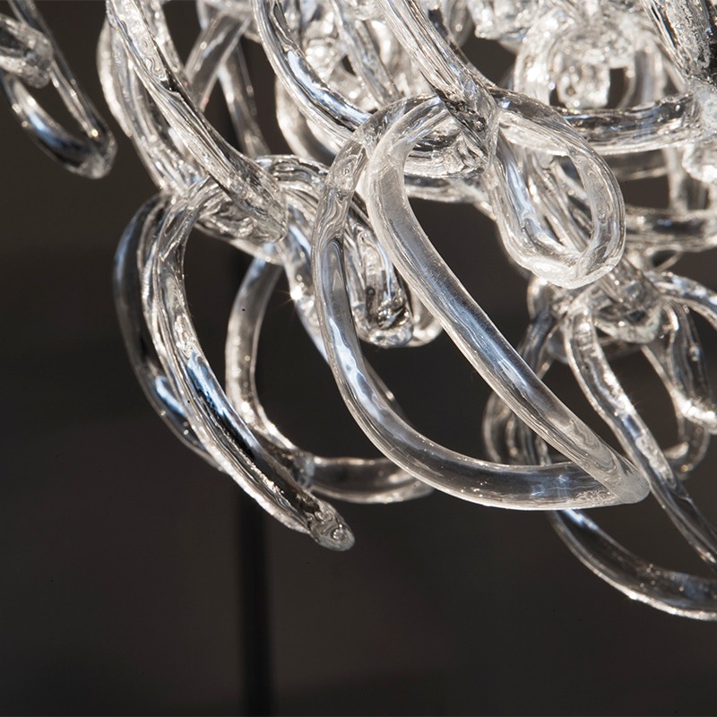 ガラスのオーナメントの組み合わせによって様々なシルエットに変化する「光の彫刻」のような照明です。