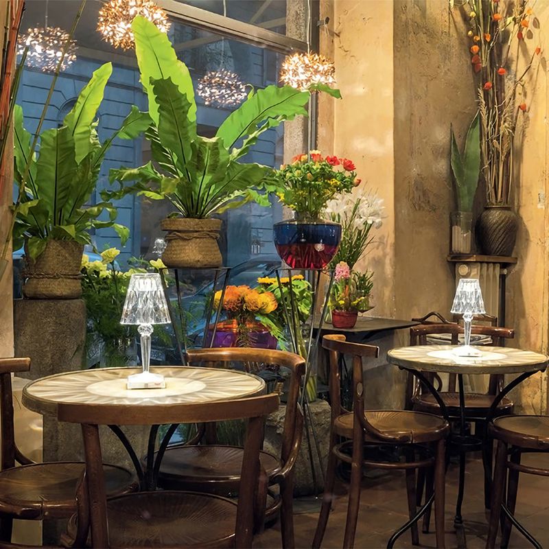 典型的なランプシェードのかたちを元に、コンテンポラリーな技術を組み合わせた照明です。5時間の満充電で6時間点灯します。