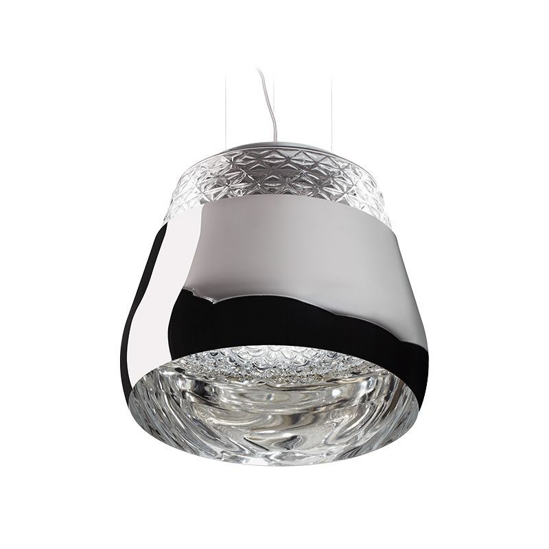 ペンダント照明「Valentine(バレンタイン)」のシェードは、クリスタルガラスと金属の異素材を組み合わせて構成されています。シェード外部に用いられたクリスタルガラスからは、点灯時に優しい光を放ちます。シェード内部のクリスタルに施された無数の花のパターンが、ベースのミラーに映り込むことで、より立体的に浮かび上がり、不思議な世界観が広がります。