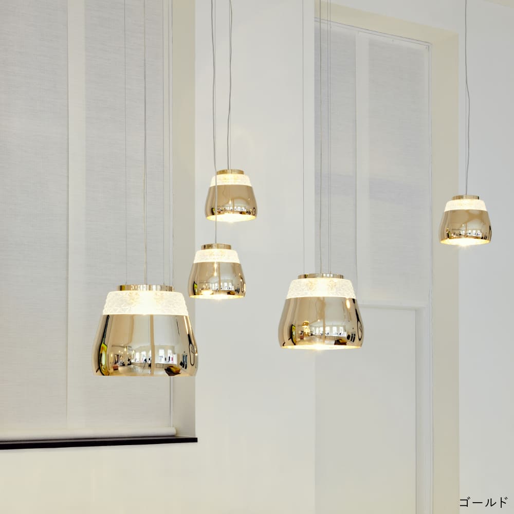 クリスタルガラスと金属の異素材を組み合わせて構成されたペンダント照明。