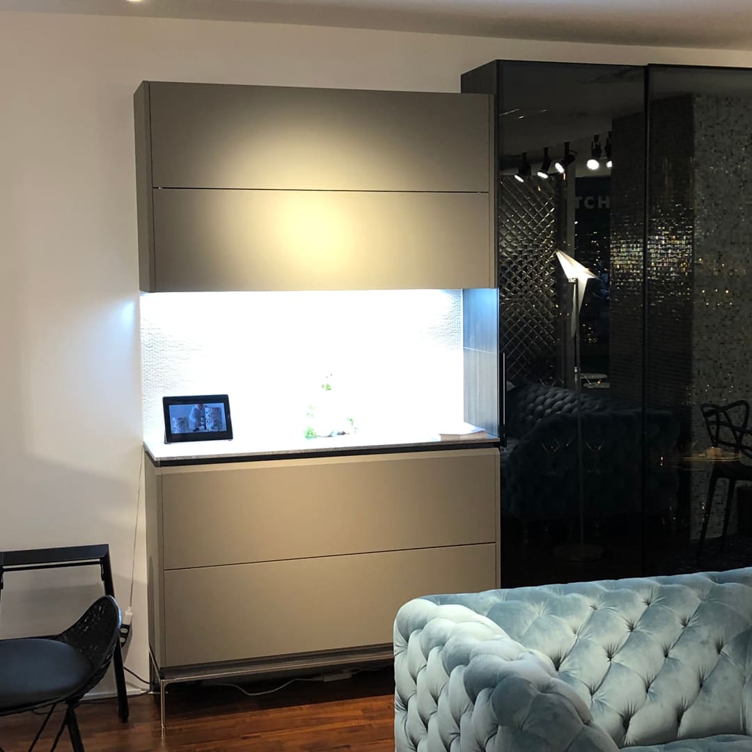 アイレベル(目の高さ)で使える壁付け収納。電動開閉システムにすれば軽く扉を押すだけのワンタッチ操作で、自動で扉を開け締めできます。