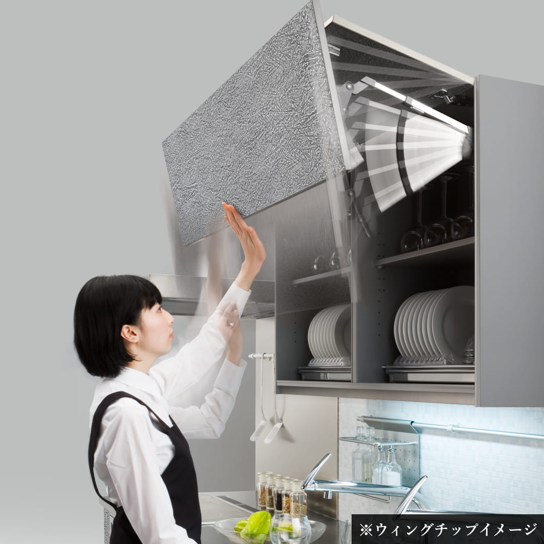 跳ね上げ式の扉は開けたままでも邪魔にならない為、キッチンで流れるような動線を実現します。