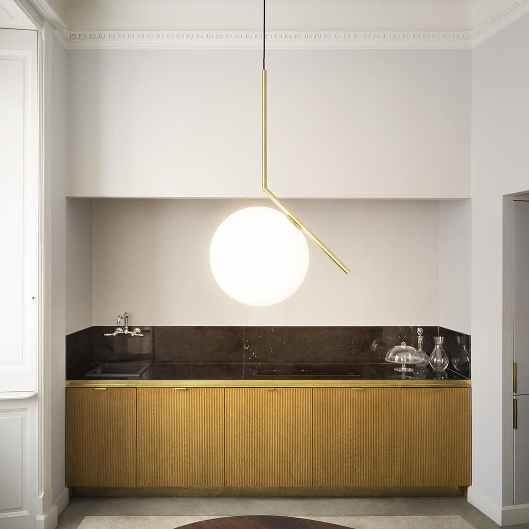 「このコレクションはバランスを探求しています。テーブルライト、ウォールライト、ペンダント、シーリングライトというシリーズがあり、すべて棒の端で完璧にバランスが取れた球体を基本形としています」とデザイナーは語ります。