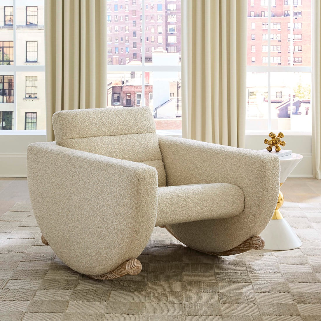 ジョナサン・アドラーのルナ ロッキング チェアは、月の弧をモチーフにした彫刻的なフォルムと、家族で使えるブークレ素材を高次元で融合させた椅子です。