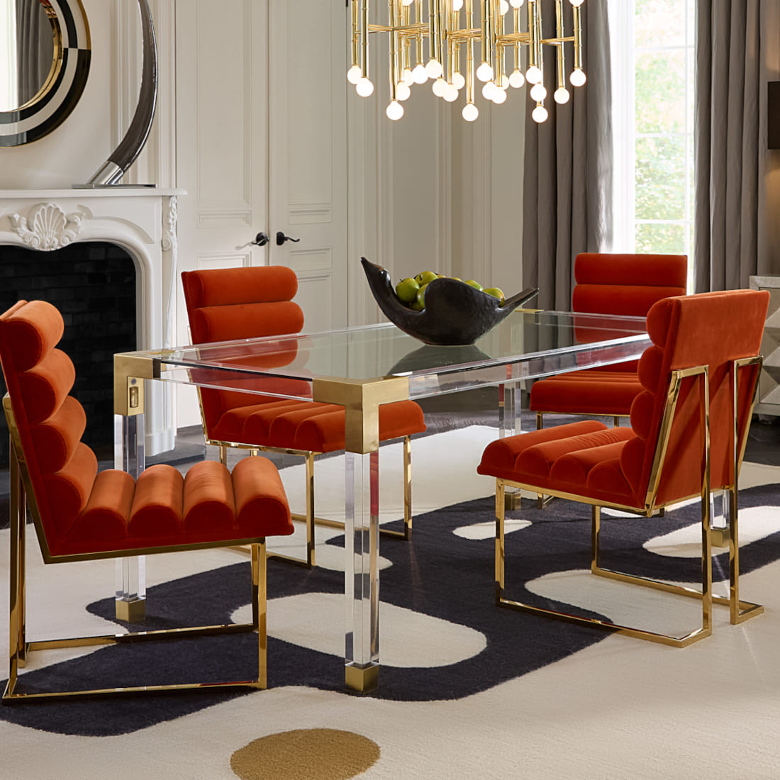 ジャック ダイニング テーブルは、クリアアクリルのフレームとブラッシュドブラスのコーナー金具で構成されています。