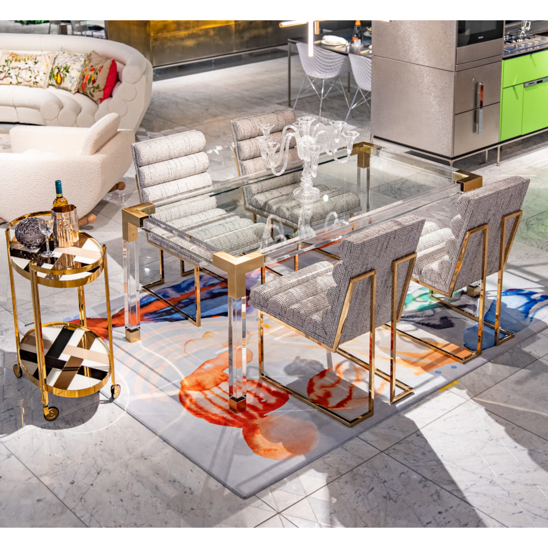 ジャック ダイニング テーブルは、クリアアクリルのフレームとブラッシュドブラスのコーナー金具で構成されています。