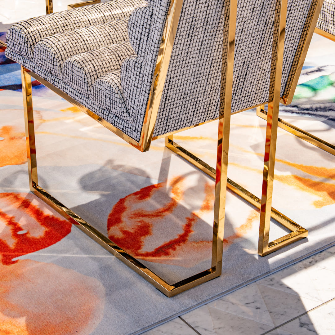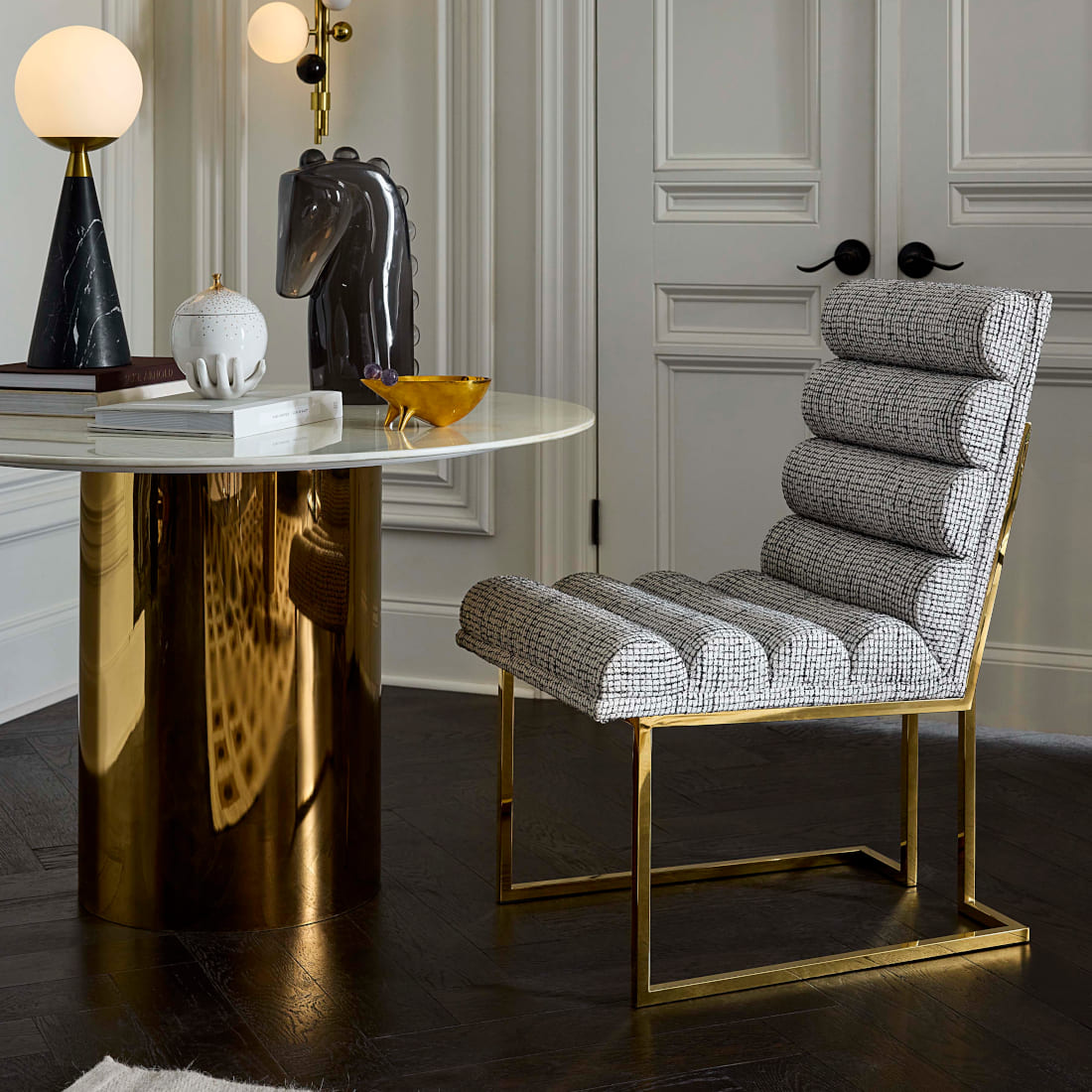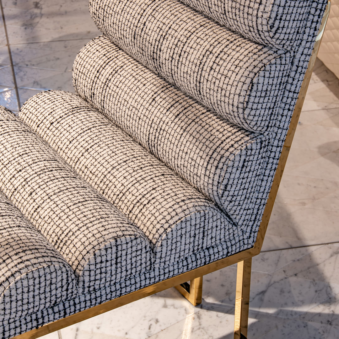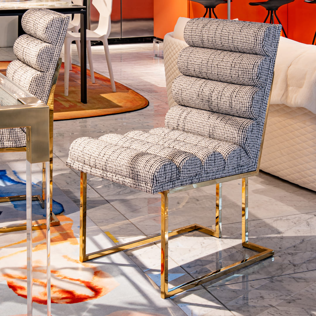チャネルドゴールドフィンガー ダイニングチェアは、1970年代のモダニズムへのオマージュと、現代的な官能性を一脚に凝縮した、ジョナサン アドラーの代表作です。