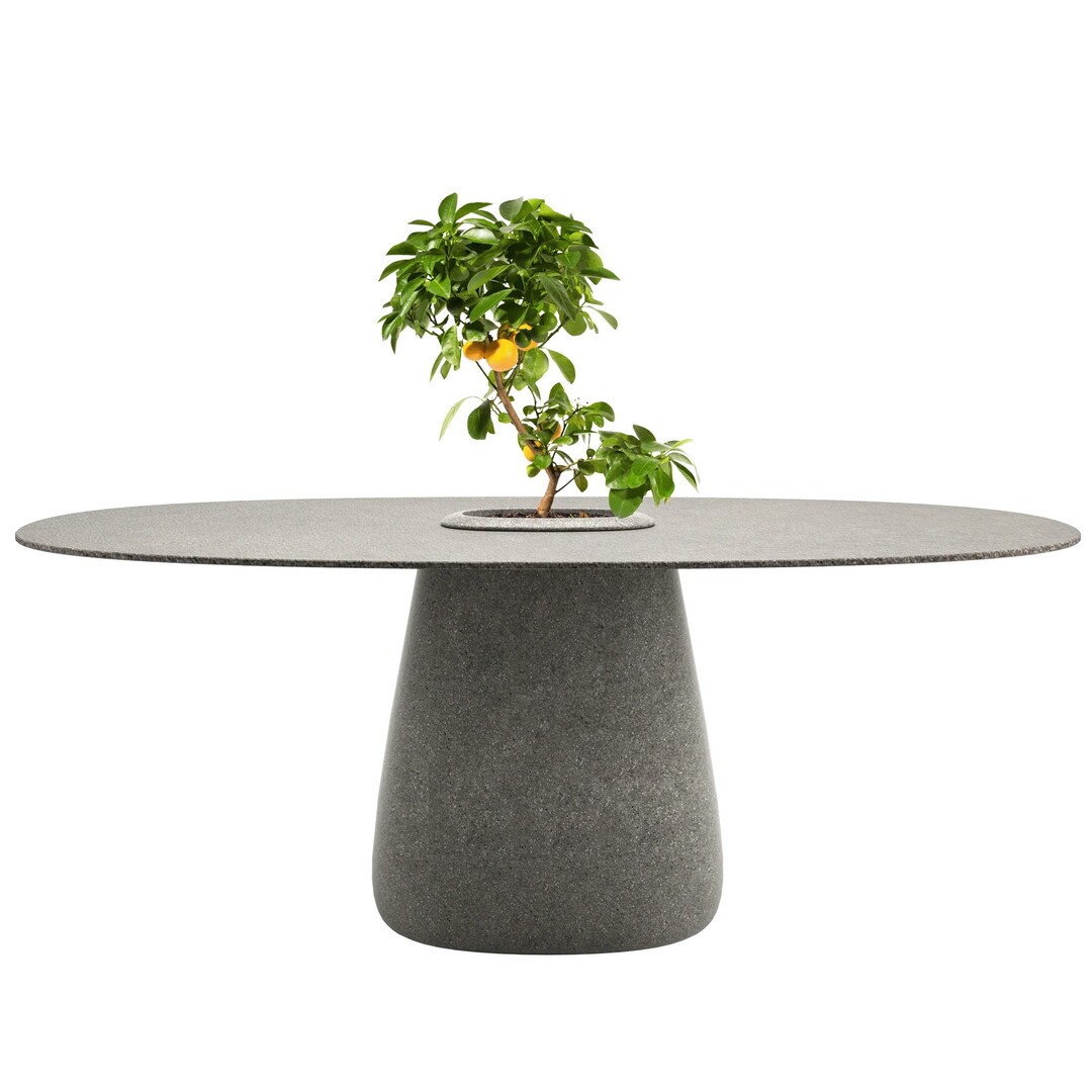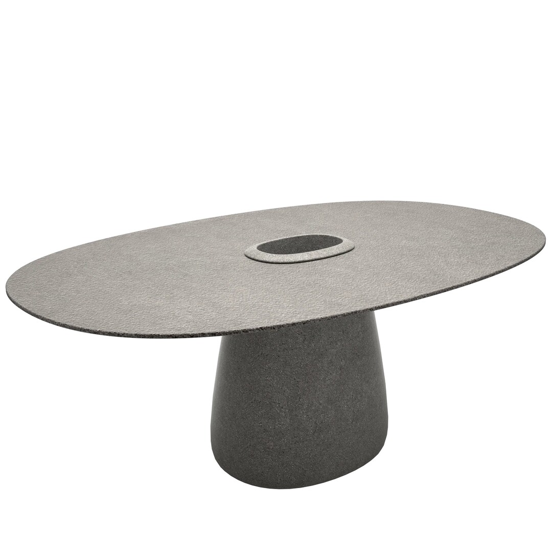 川底の丸石を思わせる有機的なフォルムに、テーブルの中心に植物や氷を仕込む遊び心を添えて。