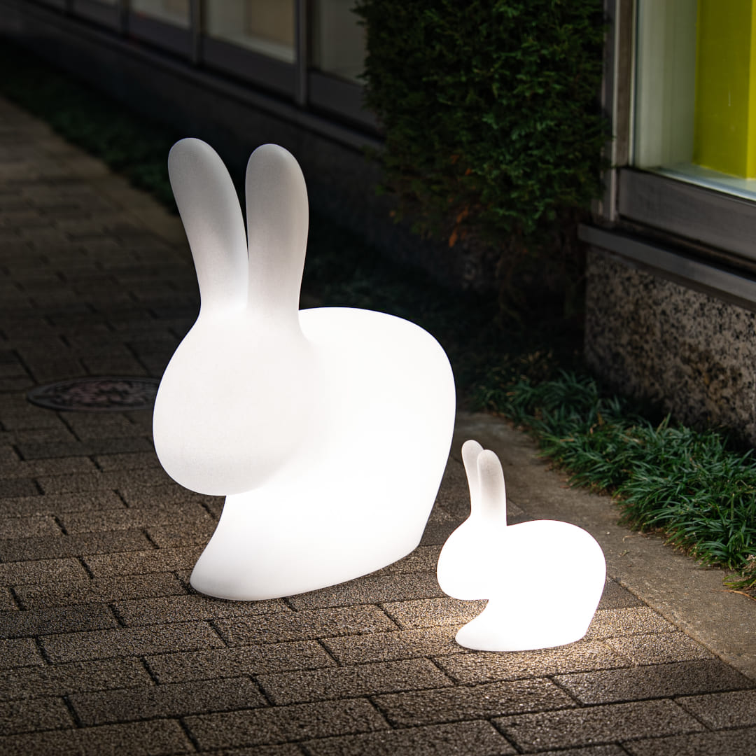 ラビットチェアに跨がって座ってみたり、足元でウサギがドアを支えてくれたり、夜にはランプになったウサギが優しく光ったり……。