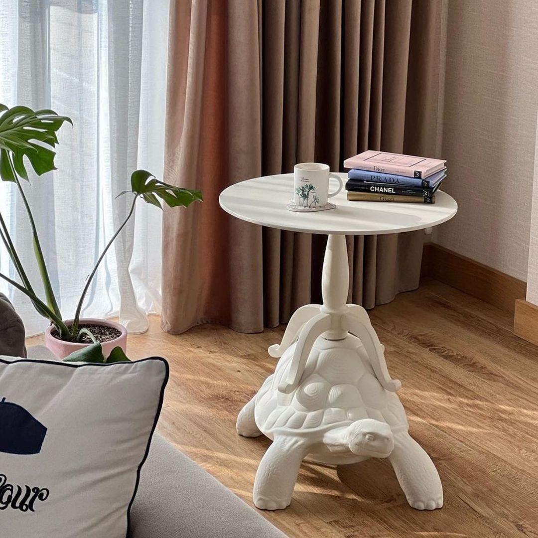 ブックケース、コーヒーテーブル、プランター、プフ、ベッドサイドテーブル、小物トレー──カメの背中が、部屋の中で何役もこなします。