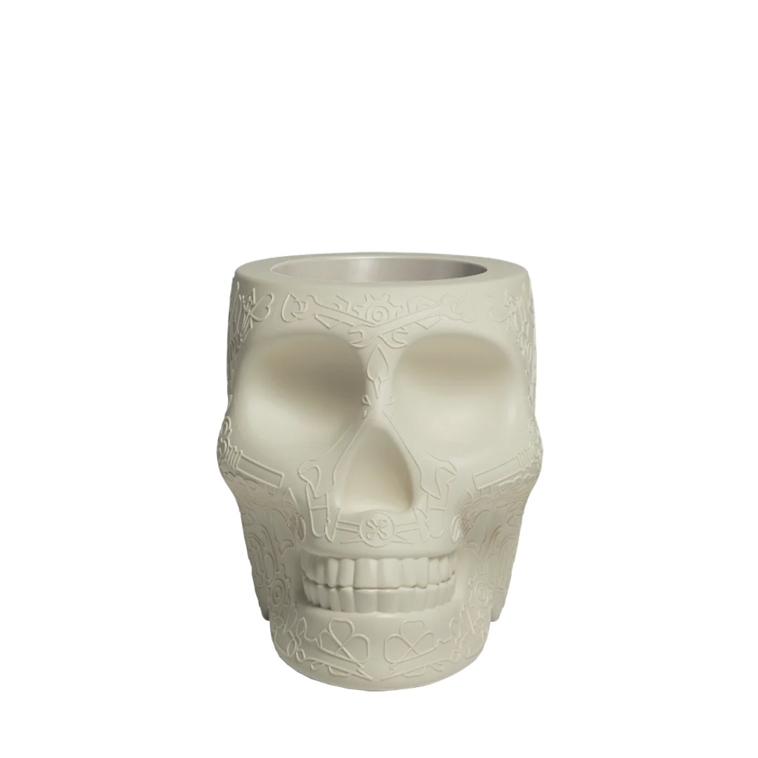 ひとつのドクロのかたちが、スツール・サイドテーブル・プランター・シャンパンクーラー・照明として機能する点が、このコレクション最大の個性です。