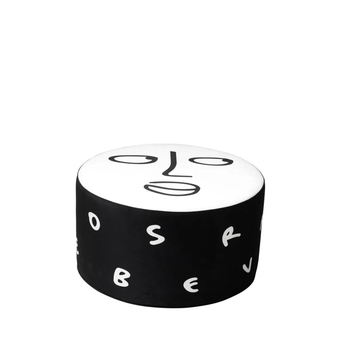 この作品郡を象徴する顔モチーフのプフ。存在感があります。Mサイズ。リビングの補助席として。