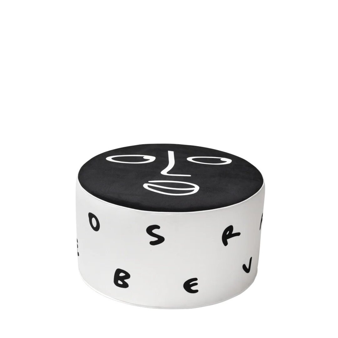 この作品郡を象徴する顔モチーフのプフ。存在感があります。Mサイズ。リビングの補助席として。