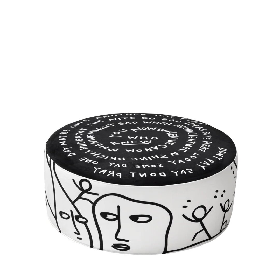 黒地に白文字で描かれた螺旋のデザインの大型プフ。ソファと合わせてセンターピースとしても活躍します。