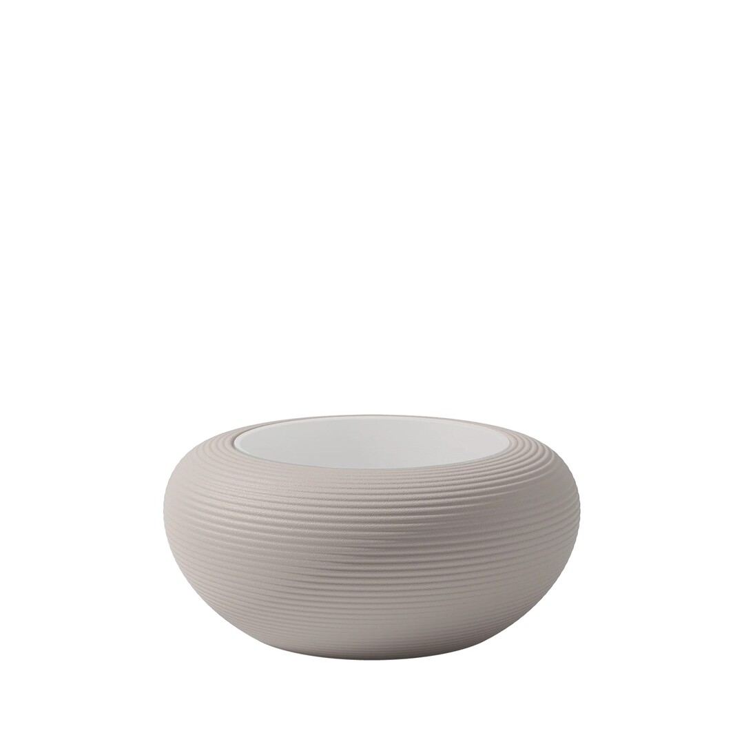 デザイナー・ステファノ・ジョバンノーニが着想した「ナミ(Nami)」は日本語で「波」を意味し、水面に石を投じたときに生まれる同心円の広がりを、家具の表面に刻み込んでいます。