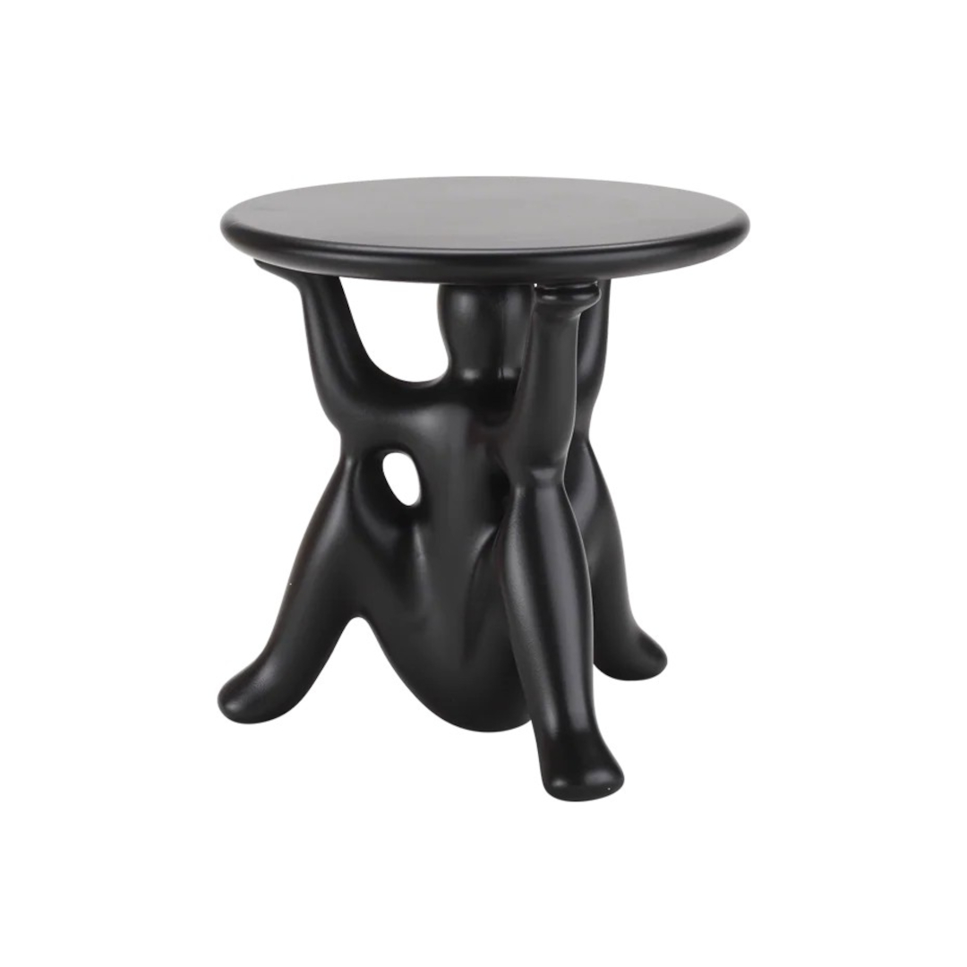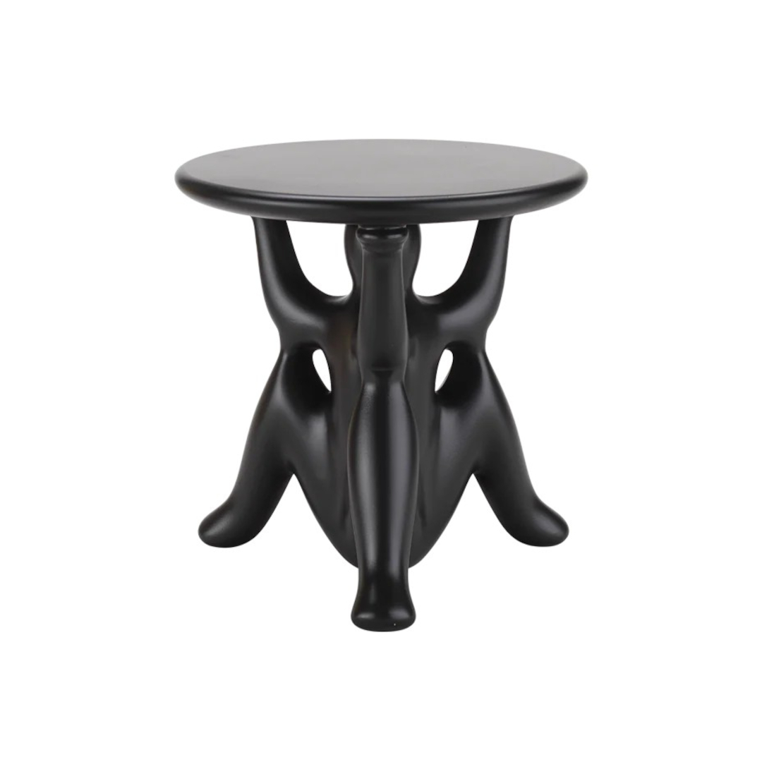 テーブルのベースが、人の形をしています。三本の脚と三本の腕を持つ像が三体、背中合わせに連なってひとつのベースを形作り、天板を高く掲げる構造です。